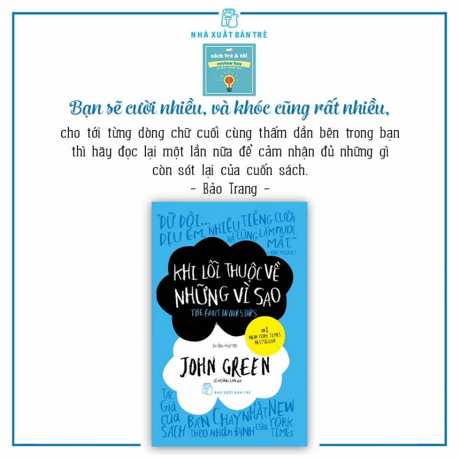 Gấp sách lại và ngắm nhìn, bạn sẽ cảm nhận sâu sắc hơn về màu xanh bao trùm không gian đọc sách của mình. Đó là một màu xanh mang dư vị của tuổi trẻ, một chút u tối, một chút gan góc, một chút lạc quan, một chút ngổ ngáo và có lẽ hơn cả là sự dịu dàng của tình yêu đôi lứa. Hãy trải nghiệm cuốn sách “Khi lỗi thuộc về những vì sao”.