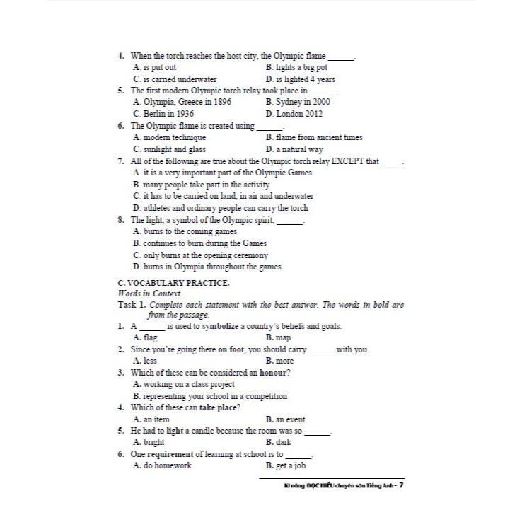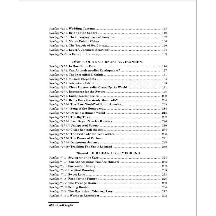 Công ty phát hành Nhà Sách Hồng Ân 2 Năm Xuất Bản 2024 Kích Thước17 x 24 cm Nhà Xuất bản Đại Học Quốc Gia hà Nội Số Trang 439 Bìa Mềm Tác Giả Lưu Hoằng Trí Sách - Kĩ Năng Đọc Hiểu Chuyên sâu Tiếng Anh (dùng chung cho các bộ sgk hiện hành) - HA Các em học sinh, sinh viên thân mến! Kĩ năng đọc hiểu có một vai trò quan trọng đối với người học tiếng Anh nói chung, đối với sinh viên Đại học, và học sinh Trung học phổ thông nói riêng. Nhằm giúp các em làm tốt bài thi, chúng tôi giới thiệu những kĩ năng đọc hiểu từ cơ bản đến nâng cao. Khi các em đã có những kĩ năng cần thiết thì có thể làm các bài tập từ dễ đến khó. Do những yêu cầu trên, chúng tôi trình bày mỗi bài đọc kèm theo ba phần luyện tập sau đây: A. Reading Comprehension (Đọc hiểu) gồm 8 câu hỏi trắc nghiệm với 4 phương án lựa chọn. B. Reading Skill (Kĩ năng đọc hiểu) trình bày lần lượt các kĩ năng đọc, trong đó các kĩ năng đọc cơ bản được rèn luyện nhiều lần. C. Vocabulary Practice (Luyện tập từ vựng) giúp học viên mở rộng vốn từ vựng, có kĩ năng đoán được từ mới dựa trên ngữ cảnh cũng như ôn luyện về căn ngữ, tiền tố, và hậu tố trong Tiếng Anh. Các bài đọc được chia thành những chủ đề thường gặp trong các đề thi như: Our Society (Xã hội của chúng ta); Our Culture (Nền văn hóa của chúng ta); Our Nature and Environment (Thiên nhiên & Môi trường); Our Health and Medicine (Sức khỏe & Y học); Science and Technology (Khoa học & Công nghệ); Education and Employment (Giáo dục & Việc làm). Sau cùng là Review Readings (Các bài đọc ôn luyện). Chúng tôi hi vọng cuốn sách này với 100 bài đọc hiểu sẽ là một tài liệu tự học bổ ích và thiết thực dành cho những người học tiếng Anh nói chung cũng như các em học sinh chuẩn bị tốt cho các kì thi tiếng Anh. Măc̣ dù tác giả đa ̃ có nhiều cố gắng trong quá trình biên soaṇ , song cuốnsách k hông thể tránh khỏi thiếu sót. Chúng tôi rất mong nhận được những đóng góp quý báu của các bạn đồng nghiệp và các em học viên để cuốn sách được hoàn thiện hơn trong lần tái bản sau.