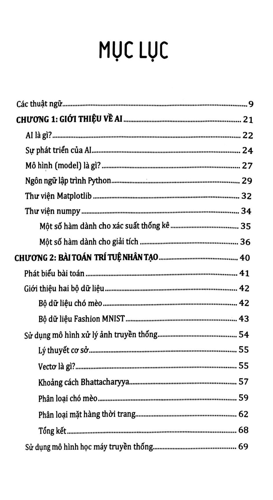 Lập Trình AI Cho Người Mới Bắt Đầu - Để Không Bỏ Lỡ Xu Thế Của Thời Đại GIỚI THIỆU VỀ CUỐN SÁCH Trí tuệ nhân tạo (Artificial Intelligence - AI) đang làm thay đổi thế giới với tốc độ chóng mặt. Từ những trợ lý ảo thông minh đến các thuật toán dự đoán phức tạp, AI đã len lỏi vào mọi ngóc ngách cuộc sống. Để bắt kịp xu hướng và tận dụng tối đa tiềm năng của AI, việc trang bị cho bản thân những kiến thức cơ bản về lập trình AI đã trở nên quan trọng hơn bao giờ hết. Cuốn sách Lập trình AI cho người mới bắt đầu ra đời nhằm đáp ứng nhu cầu đó. Cuốn sách sẽ giúp các lập trình viên từ mọi trình độ nhanh chóng nắm vững những kiến thức cốt lõi để có thể tự tin khám phá và ứng dụng AI vào công việc của m.ình. Cuốn sách được thiết kế dành riêng cho lập trình viên mới tiếp xúc với AI. Với cách tiếp cận đơn giản, cuốn sách không chỉ cung cấp nền tảng kiến thức vững chắc về trí tuệ nhân tạo mà còn hướng dẫn bạn từng bước xây dựng các mô hình AI thực tế. Nhờ những ví dụ sinh động và bài tập thực hành phong phú, các lập trình viên sẽ nhanh chóng nắm vững các khái niệm cốt lõi và tự tin áp dụng AI vào các dự án của m.ình. Sách gồm 5 chương với các nội dung chính sau: Chương 1: Giới thiệu về AI Chương này sẽ cung cấp cái nhìn tổng quan về trí tuệ nhân tạo (AI), bắt đầu với định nghĩa cơ bản, lịch sử phát triển của nó, và những ứng dụng thực tế mà AI mang lại trong các lĩnh vực như y tế, tài chính, giao thông. Bên cạnh đó, chúng ta cũng sẽ tìm hiểu các công cụ quan trọng để làm việc với AI, như ngôn ngữ lập trình Python và các thư viện phổ biến hỗ trợ việc xây dựng mô hình AI. Chương 2: Bài toán trí tuệ nhân tạo Trong chương này, bạn sẽ được làm quen với các phương pháp giải quyết bài toán AI. Đầu tiên, chúng ta sẽ tìm hiểu về học máy truyền thống, với các thuật toán như SVM và Cây quyết định (Decision Trees). Sau đó, chúng ta sẽ khám phá các mô hình phức tạp hơn như Mạng nơ-ron, CNN, RNN, đồng thời sử dụng công cụ PyTorch để thực hành. Cuối cùng, chúng ta sẽ áp dụng các kiến thức này để giải quyết một bài toán thực tế. Chương 3: Ứng dụng vào thực tế Chương này sẽ giúp bạn hiểu rõ quy trình xây dựng một hệ thống AI từ đầu đến cuối. Bạn sẽ học cách thiết kế, cài đặt, và triển khai mô hình AI trong thực tế. Đây là phần quan trọng, giúp bạn nắm bắt cách thức áp dụng lý thuyết vào các dự án thực tế và phát triển các ứng dụng AI. Chương 4: ChatGPT Chương này sẽ giới thiệu về ChatGPT, một trong những ứng dụng phổ biến của AI trong lĩnh vực xử lý ngôn ngữ tự nhiên. Bạn sẽ hiểu cơ chế hoạt động của ChatGPT và cách nó có thể được ứng dụng. Hơn nữa, bạn sẽ học cách phát triển các ứng dụng sử dụng ChatGPT để giải quyết các vấn đề thực tiễn. Chương 5: Định hướng nghề nghiệp Cuối cùng, chương này sẽ giúp bạn định hướng nghề nghiệp trong lĩnh vực AI, giới thiệu các vai trò khác nhau trong ngành và kỹ năng cần thiết để thành công. Bạn sẽ tìm hiểu về thị trường việc làm hiện tại, cơ hội phát triển nghề nghiệp, cũng như các bước phát triển bản thân để tiến xa trong ngành AI. Lập trình AI cho người mới bắt đầu sẽ là một cuốn sách hữu ích, giúp bạn nắm vững kiến thức về AI trong lập trình, hỗ trợ bạn tự động hóa nhiều công việc lặp đi lặp lại, giải phóng thời gian để bạn tập trung vào những sáng tạo mới. Cuốn sách này sẽ không chỉ mở ra cơ hội nghề nghiệp hấp dẫn mà còn giúp bạn trở thành một chuyên gia lập trình AI trong thời đại mới. VỀ TÁC GIẢ TS. Lương Anh Vũ: Tốt nghiệp chuyên ngành Học máy (Machine Learning) tại Đại học Griffith, Úc; đồng sáng lập tổ chức mã nguồn mở Young Monkeys. Tạ Văn Dũng: Đồng sáng lập Young Monkeys. Anh là tác giả của những cuốn sách: Làm chủ các mẫu thiết kế kinh điển trong lập trình và Những nguyên tắc sống còn trong lập trình.