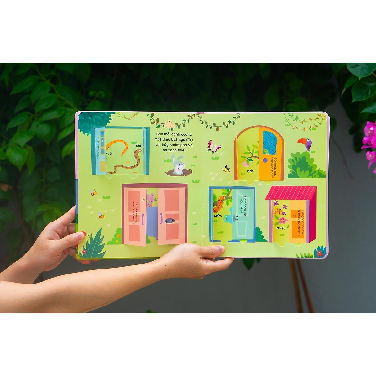 Thông qua các miếng LẬT - MỞ kết hợp với minh họa dễ thương về chủ đề động vật, thực vật, trẻ sẽ dễ dàng nhận biết được các khái niệm như: cao hơn, to hơn, dài hơn, nặng hơn, ở trong, ở ngoài v.v
