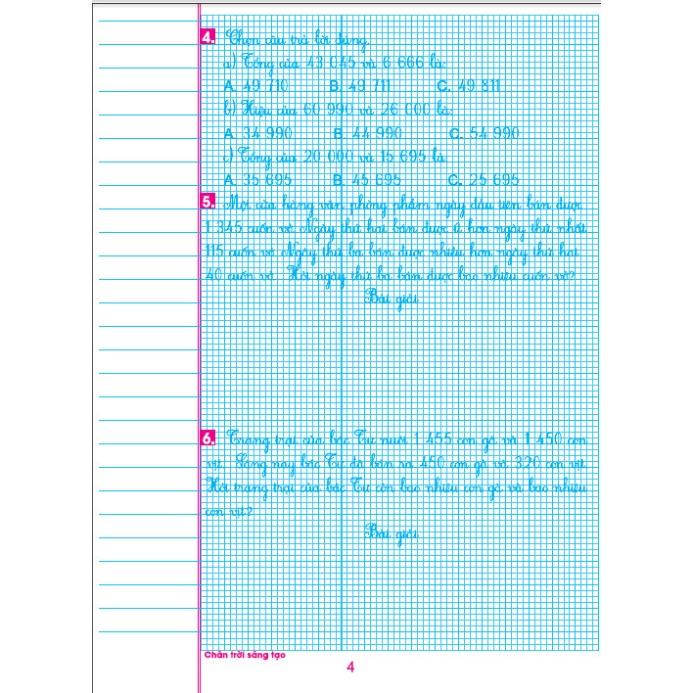 Luyện Tập Toán 4 - Trình Bày Trên Giấy Ô Li là cuốn sách do nhóm tác giả là những nhà giáo nhiều kinh nghiệm dạy ở các trường Sư phạm và chuyên viên phụ trách môn Toán tiểu học biên soạn theo chuẩn kiến thức, kĩ năng của SGK Chân Trời Sáng Tạo của Bộ Giáo dục và Đào tạo, với mục đích: Cung cấp tài liệu để giáo viên tham khảo, nhằm đổi mới phương pháp dạy học và luyện tập cho học sinh học buổi thứ hai. Hỗ trợ cho học sinh khả năng tự học, tự rèn luyện kiến thức cơ bản đã học và phát triển năng lực tư duy toán học một cách thông minh, * Góp phần