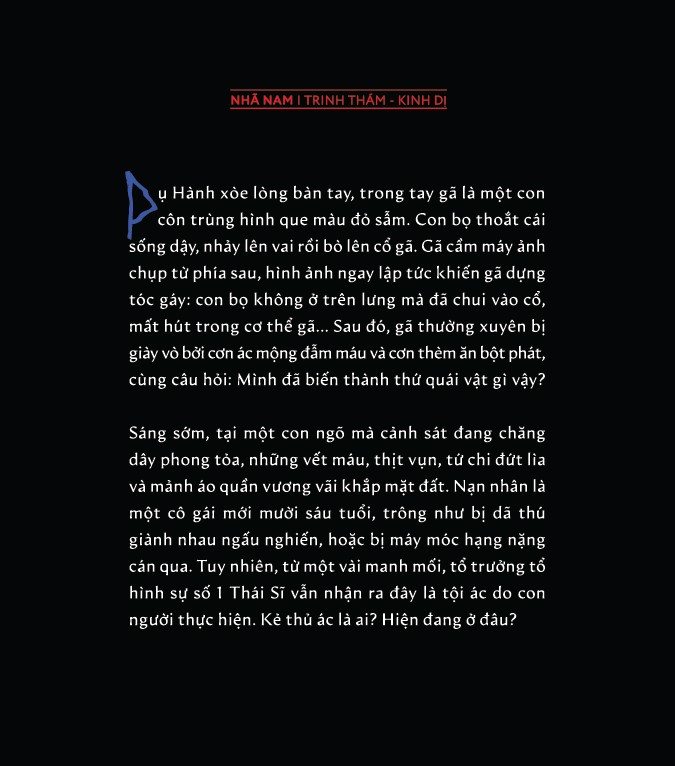 Dụ Hành xòe lòng bàn tay, trong tay gã là một con côn trùng hình que màu đỏ sẫm. Con bọ thoắt cái sống dậy, nhảy lên vai rồi bò lên cổ gã. Gã cầm máy ảnh ngay lập tức khiến gã dựng tóc gáy: con bọ không ở trên lưng mà đã chui vào cổ, mất hút trong cở thể gã,.. Sau đó, gã thường xuyên bị giày vò bởi cơn ác mộng đẫm máu và cơn thèm ăn bột phát, cùng câu hỏi: Mình đã biến thành thứ quái vật gì vật?