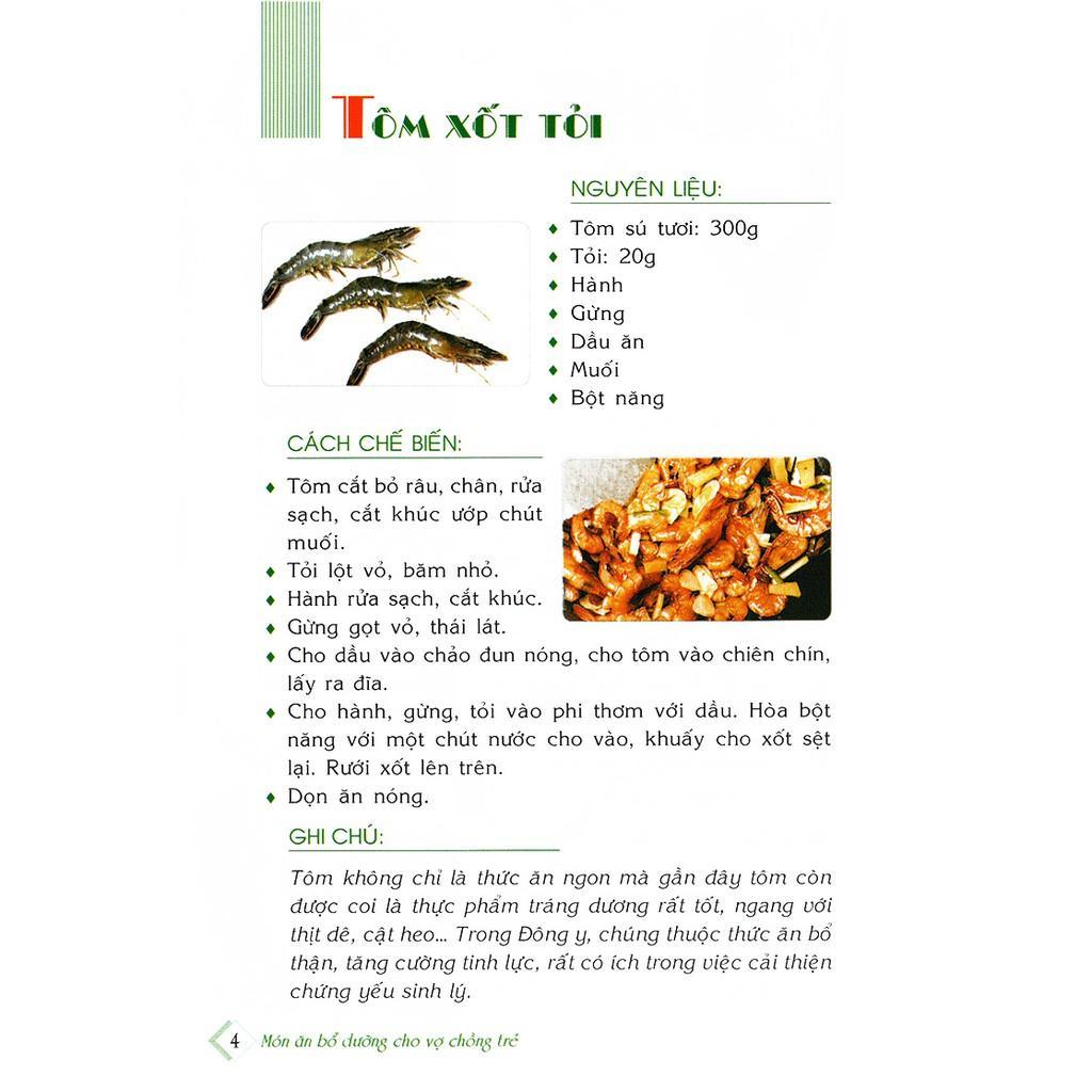 Mục Lục 1- Tôm xốt tỏi 2- Tôm Tươi xào hẹ 3- Tôm chiên rượu 4- Canh đậu hủ tôm tươi 5- Trứng gà xào cà rốt 6- Trứng gà xào hẹ 7- Canh trứng nấu rong biển 8- Hàu chiên trứng 9- Lươn xào cay 10- Canh cá chạch hoàng kỳ 11- Cật heo xào dầu mè 12- Hoa kim châm xào cật heo 13- Thịt xào hẹ 14- Lá sách bò xào hành 15- Câu kỷ hầm pín bò 16- Canh pín bò tráng dương 17- Thịt dê xào khoai tây 18- Thịt dê ngũ hương 19- Cháo câu kỷ cật dê 20- Thịt chó kho trứng gà 21- Canh thịt chó tráng dương 22- Bồ câu hầm câu kỷ tử 23- Chim cút tráng dương 24- Gà trống hấp rượu 25- Câu kỷ hầm gà giò 26- Gà hầm nhân sâm trong nồi đất 27- Cháo nhân sâm 28- Vịt hầm đông trùng hạ thảo 29 Cháo hải sâm 30- Chè trứng cút bách hợp, hạt sen