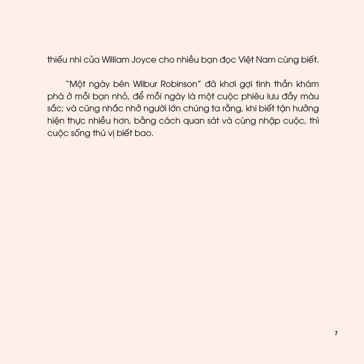 các bạn nhỏ. Chúng tôi trân trọng giới thiệu tới bạn đọc cuốn sách “Một ngày bên Wilbur Robinson” thuộc Tủ sách Buồm Trăng của Book Hunter, do Nguyệt Mỹ (10 tuổi) chuyển ngữ. Nguyệt Mỹ có thói quen đọc truyện cho hai em nhỏ nghe mỗi ngày và đặc biệt thích những tác phẩm của William Joyce, luôn muốn chia sẻ thế giới trong truyện thiếu nhi của William Joyce cho nhiều bạn đọc Việt Nam cùng biết.