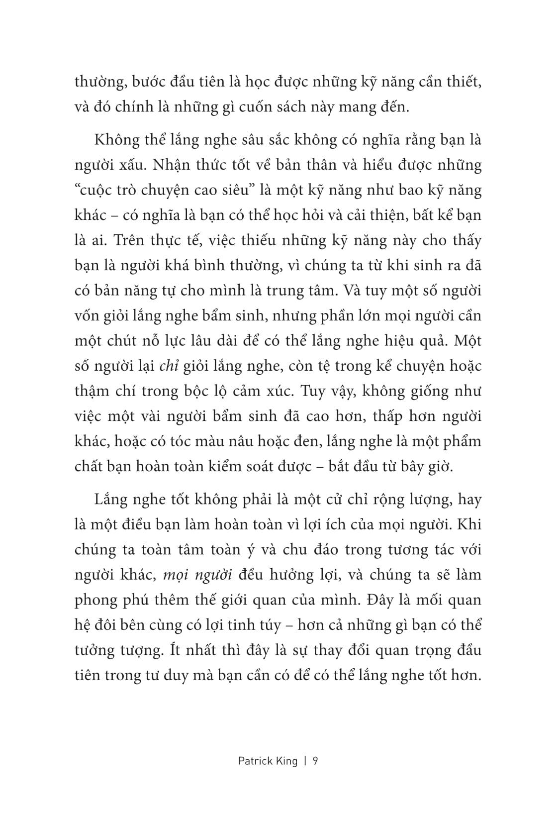 Trong thời đại ngày nay, nghệ thuật lắng nghe quả là một siêu năng lực. Nếu bạn có thể khiến người khác cảm thấy được lắng nghe và trân trọng, bạn đã mở ra con đường dẫn thẳng đến trái tim họ. Và tác giả Patrick King sẽ cho bạn thấy, làm chủ kỹ năng đó không hề phức tạp như bạn vẫn nghĩ!
