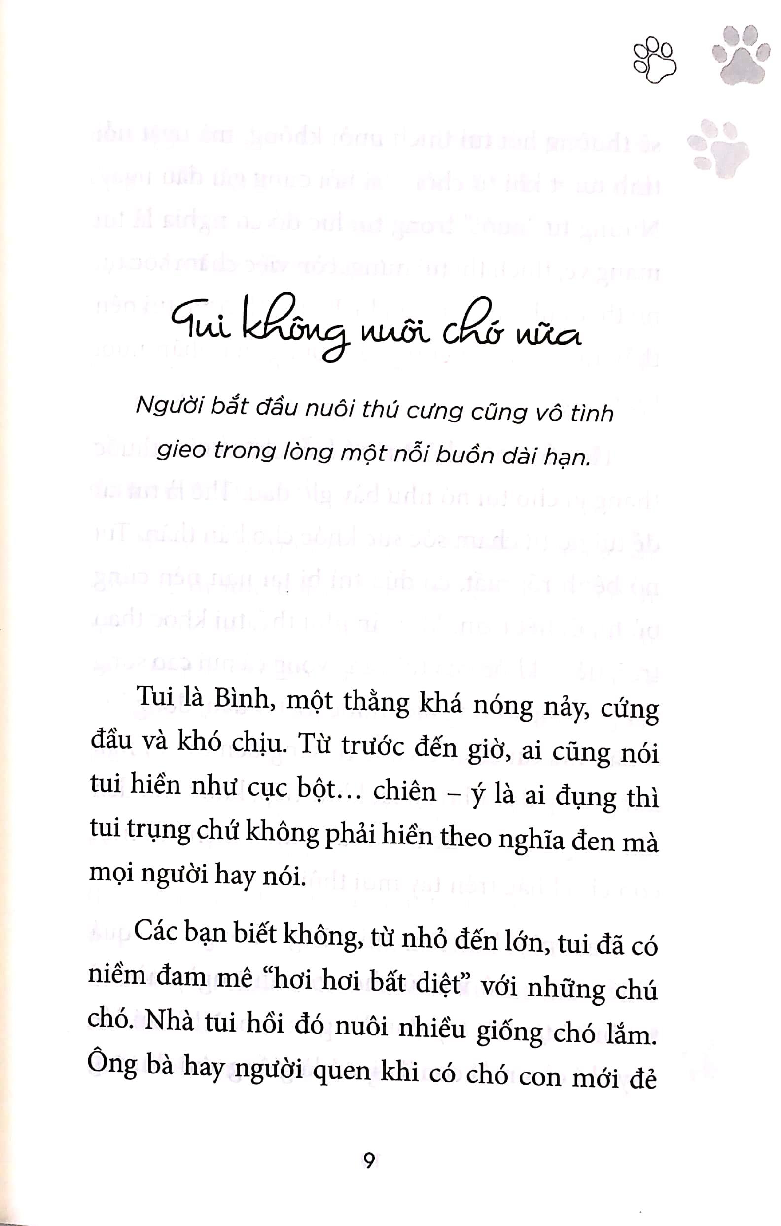 Với câu từ gần gũi, giản dị và lối kể chuyện đáng yêu, những câu chuyện nhỏ trong cuốn sách sẽ khiến bạn đọc bật cười trước những tình huống mà ai-nuôi-thú-cưng-cũng-gặp, có lúc lại rơm rớm nước mắt trước những sự chia ly không thể nào lường trước. Từ hành trình lựa chọn giống chó phù hợp, nuôi dạy cún cưng thông thạo các mệnh lệnh, xử lý ra sao khi các bé bị ốm và những yêu thương không sao kể đủ của những người nuôi thú cưng được tác giả trần thuật một cách vô cùng chân thực trong cuốn sách.