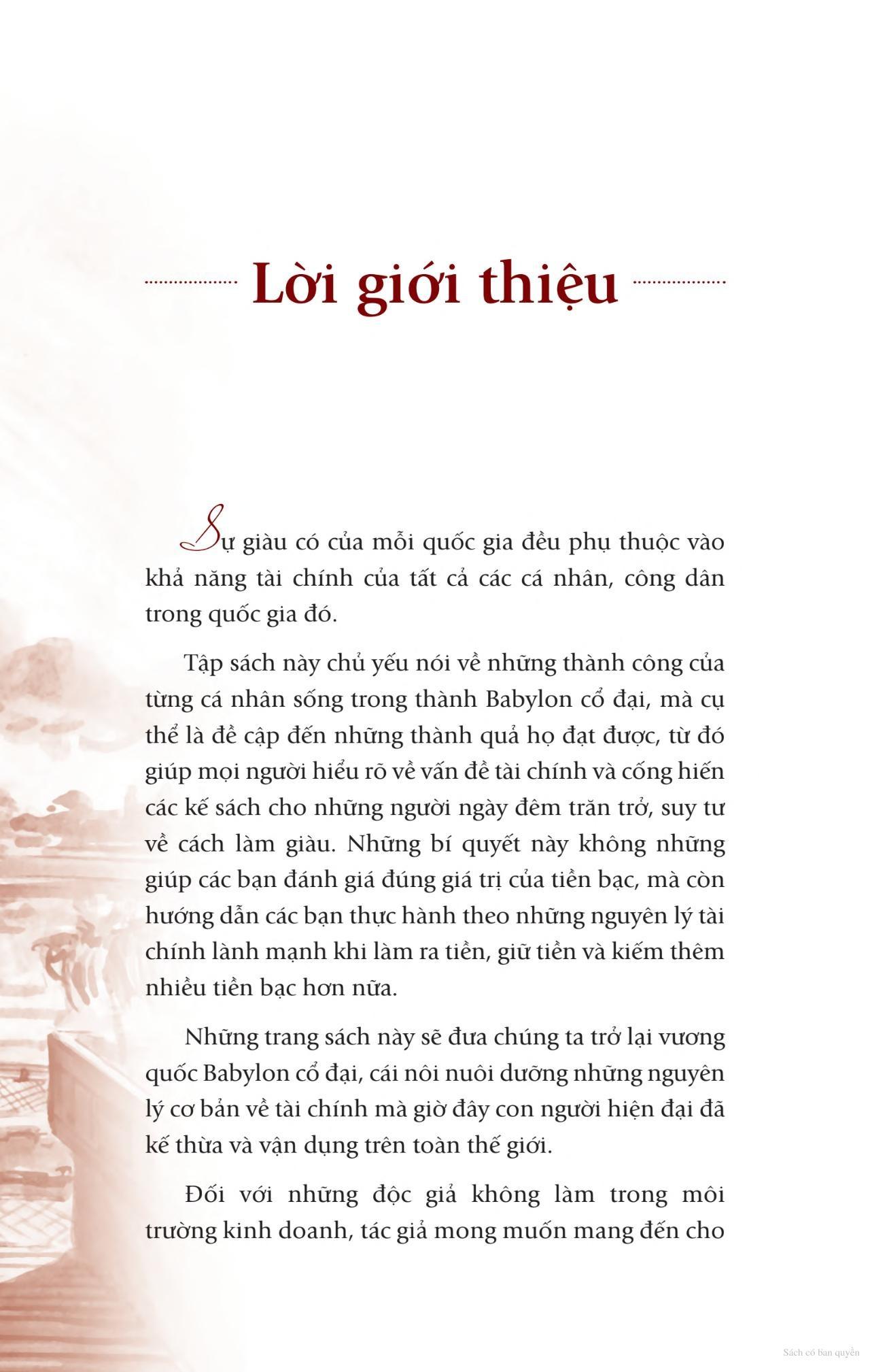 Người giàu có nhất thành Babylon sẽ đưa chúng ta trở lại vương quốc Babylon cổ đại, cái nôi nuôi dưỡng những nguyên lý cơ bản về tài chính mà giờ đây con người hiện đại đã kế thừa và vận dụng trên toàn thế giới.