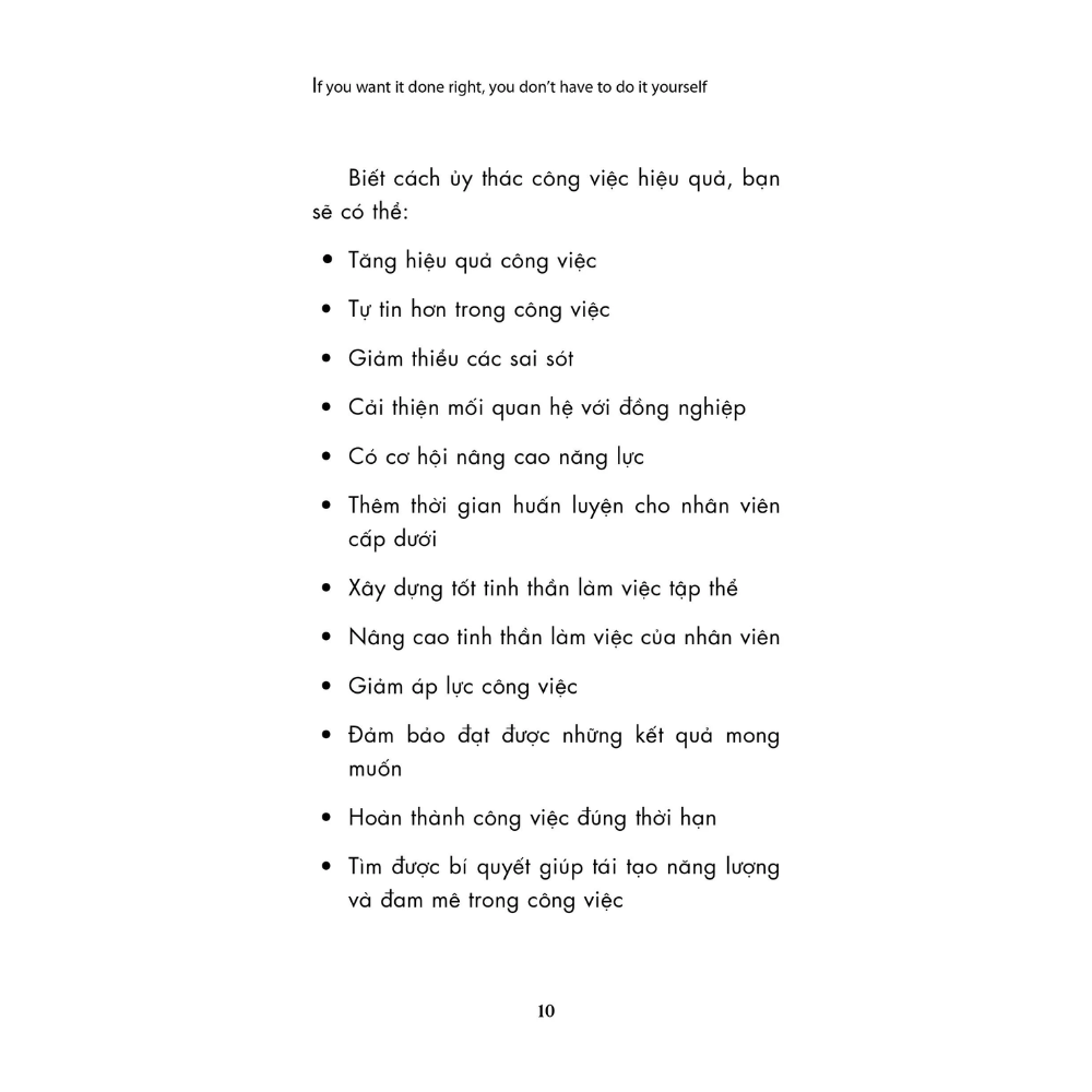 Chỉ cần trả lời “Có” cho bất cứ vấn đề nào nêu trên thì đây chính là quyển sách dành cho bạn, giúp bạn giải quyết hiệu quả công việc và cải thiện đáng kể cuộc sống của mình! Và theo tác giả, dù là người ủy thác hay được ủy thác công việc, nhưng nếu biết ứng dụng sáu nguyên tắc nêu ra trong cuốn sách này, chắc chắn bạn sẽ cảm thấy khối lượng công việc giảm đi đáng kể. Nhờ vậy bạn sẽ có thêm nhiều thời gian để tập trung vào những điều thật sự quan trọng trong công việc và trong cuộc sống.