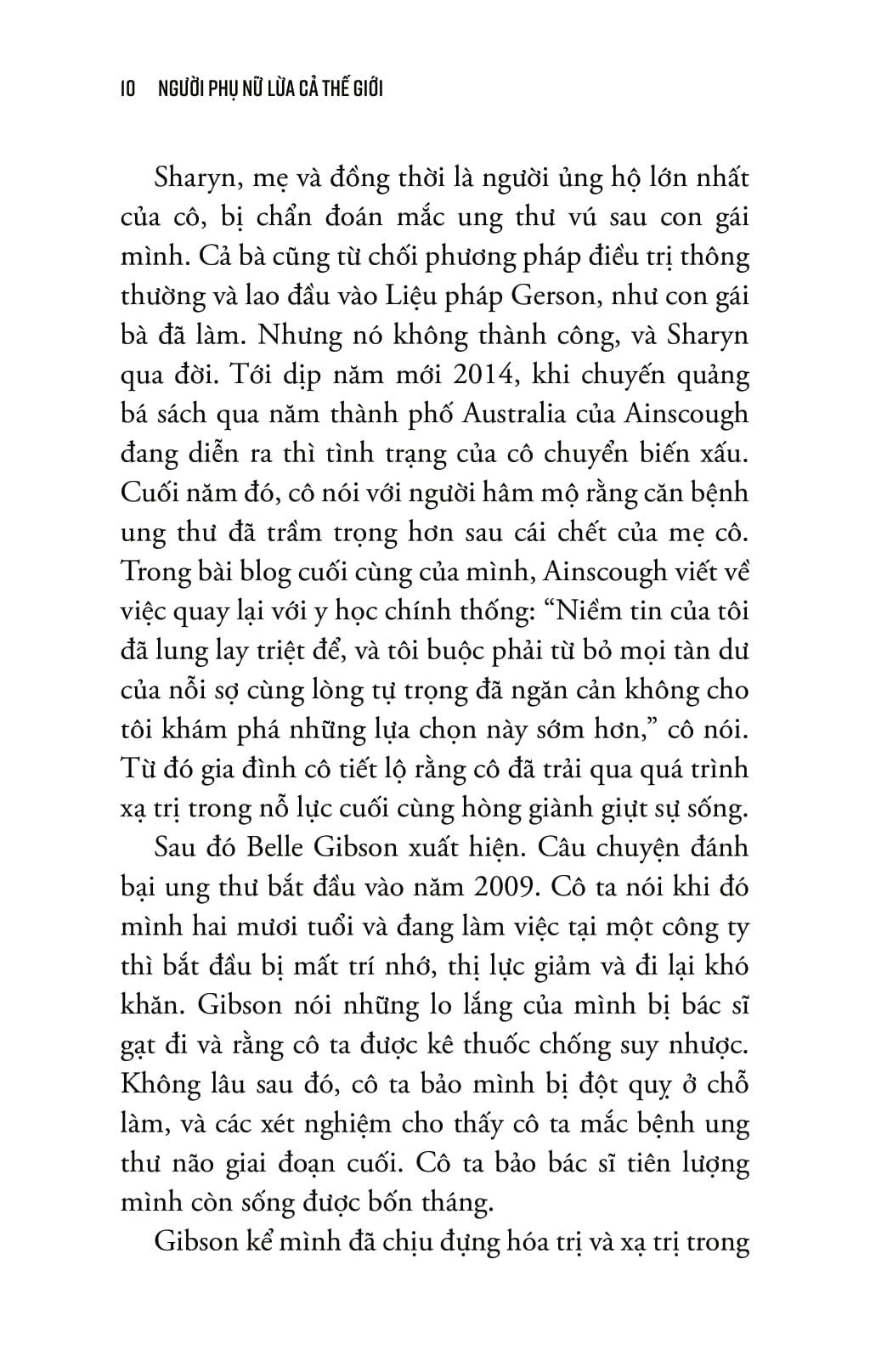 NGƯỜI PHỤ NỮ LỪA CẢ THẾ GIỚI (The Woman Who Fooled the World: Belle Gibson’s Cancer Con, and the Darkness at the Heart of the Wellness Industry) do hai nhà báo Beau Donelly và Nick Toscano viết, là một tác phẩm phi hư cấu xuất sắc phản ánh sự lừa đảo tinh vi trong thế giới sức khỏe và truyền thông.