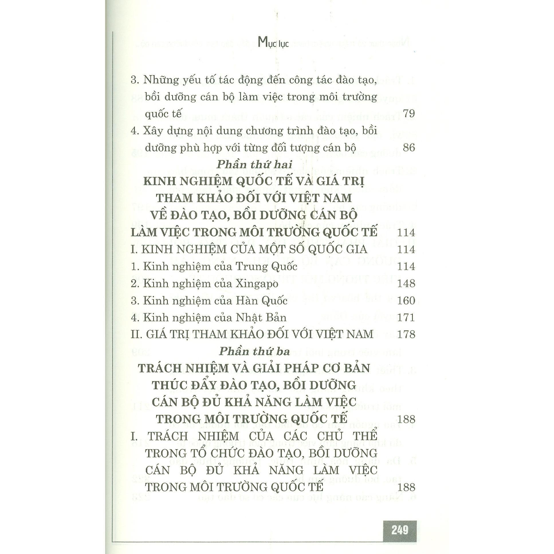 Cuốn sách là tổng hợp các bài tham luận trong hội thảo khoa học “Đào tạo, bồi dưỡng cán bộ đủ khả năng làm việc trong môi trường quốc tế” do Ban Tổ chức Trung