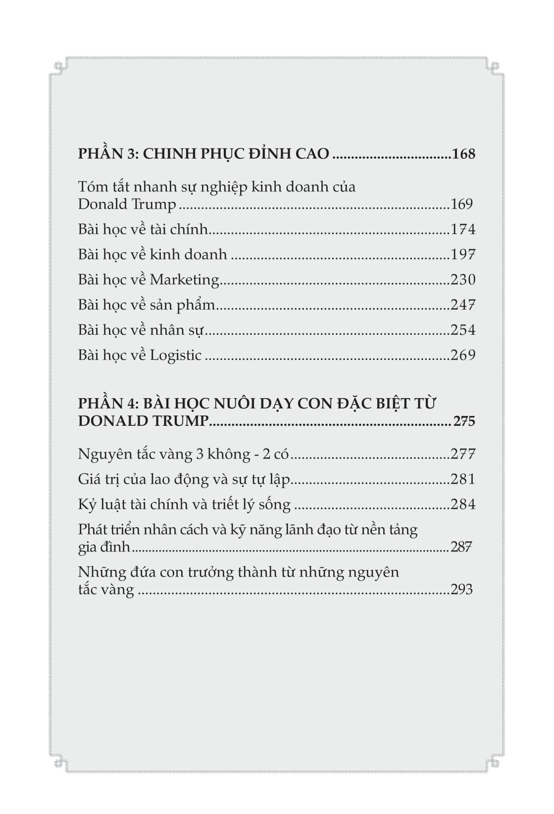 Phần 3: Chinh phục đỉnh cao: Phần này tập trung vào những bài học kinh doanh và chính trị mà bạn đọc có thể học hỏi từ Trump. Những bài học về tài chính, kinh doanh, marketing, quản lý nhân sự,... được phân tích một cách chi tiết, giúp bạn hiểu rõ hơn về chiến lược, tư duy và cách thức hoạt động của một doanh nhân và chính trị gia thành đạt. Bạn sẽ được làm quen với những chiến lược kinh doanh táo bạo, những quyết định mạo hiểm, và những bài học đắt giá từ những thành công và thất bại của Trump.