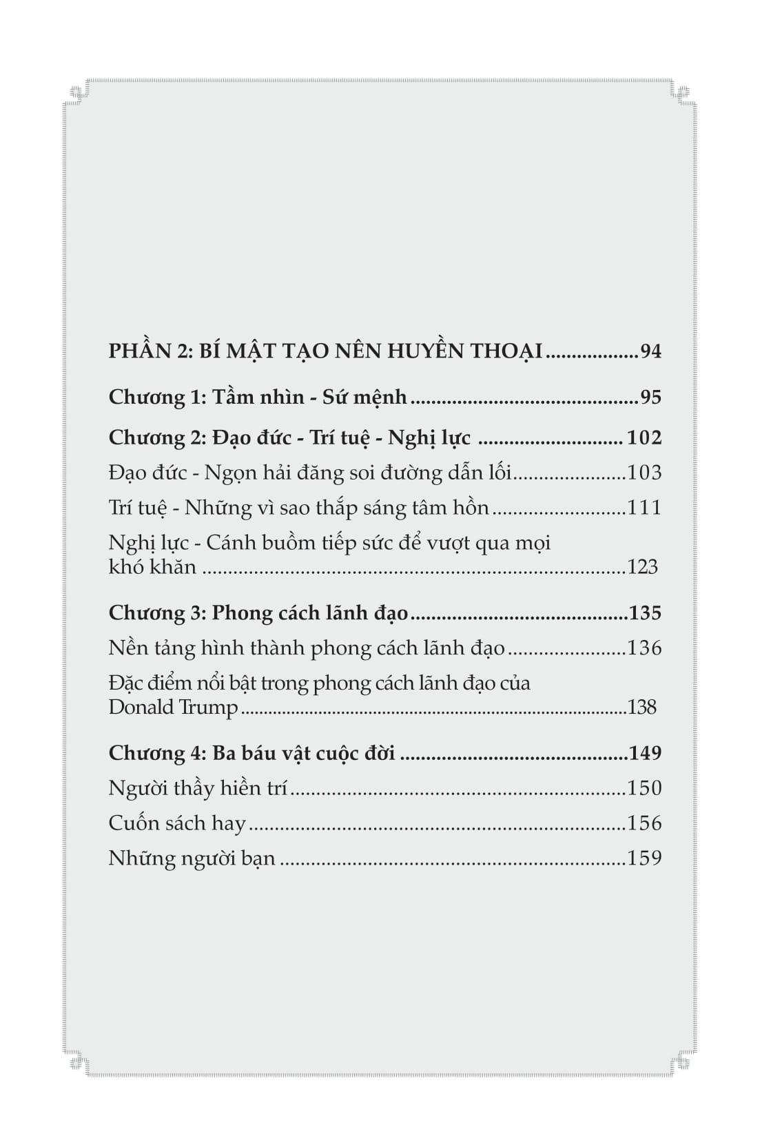 Phần 2: Bí mật tạo nên huyền thoại: Phần này đi sâu vào phân tích những yếu tố tạo nên thành công của Trump, bao gồm đạo đức, trí tuệ, nghị lực, và phong cách lãnh đạo đặc biệt của ông. Tác giả sẽ giải mã những bí quyết giúp ông vượt qua khó khăn, chinh phục thử thách, và đạt được những thành tựu phi thường. Bạn sẽ được tìm hiểu về tầm nhìn, sứ mệnh, giá trị cốt lõi, và những nguyên tắc sống của Trump, những yếu tố đã thúc đẩy ông vươn lên đỉnh cao.