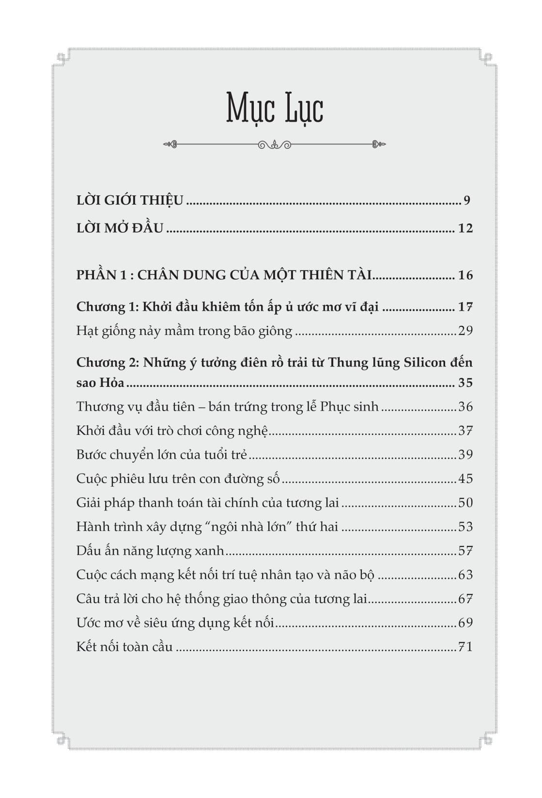 Ba phần của cuốn sách được chia làm 14 chương với nhiều nội dung xoay quan cuộc đời của Elon Musk