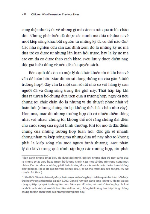 Công trình nghiên cứu của Tiến sĩ Stevenson còn đưa ra một cái nhìn tổng quan về lịch sử của niềm tin vào luân hồi, các bằng chứng củng cố niềm tin này thông qua các vết bớt, dị tật bẩm sinh… Cả những thành tựu mới trong lĩnh vực di truyền học cũng được tác giả khéo léo lồng ghép vào quyển sách.