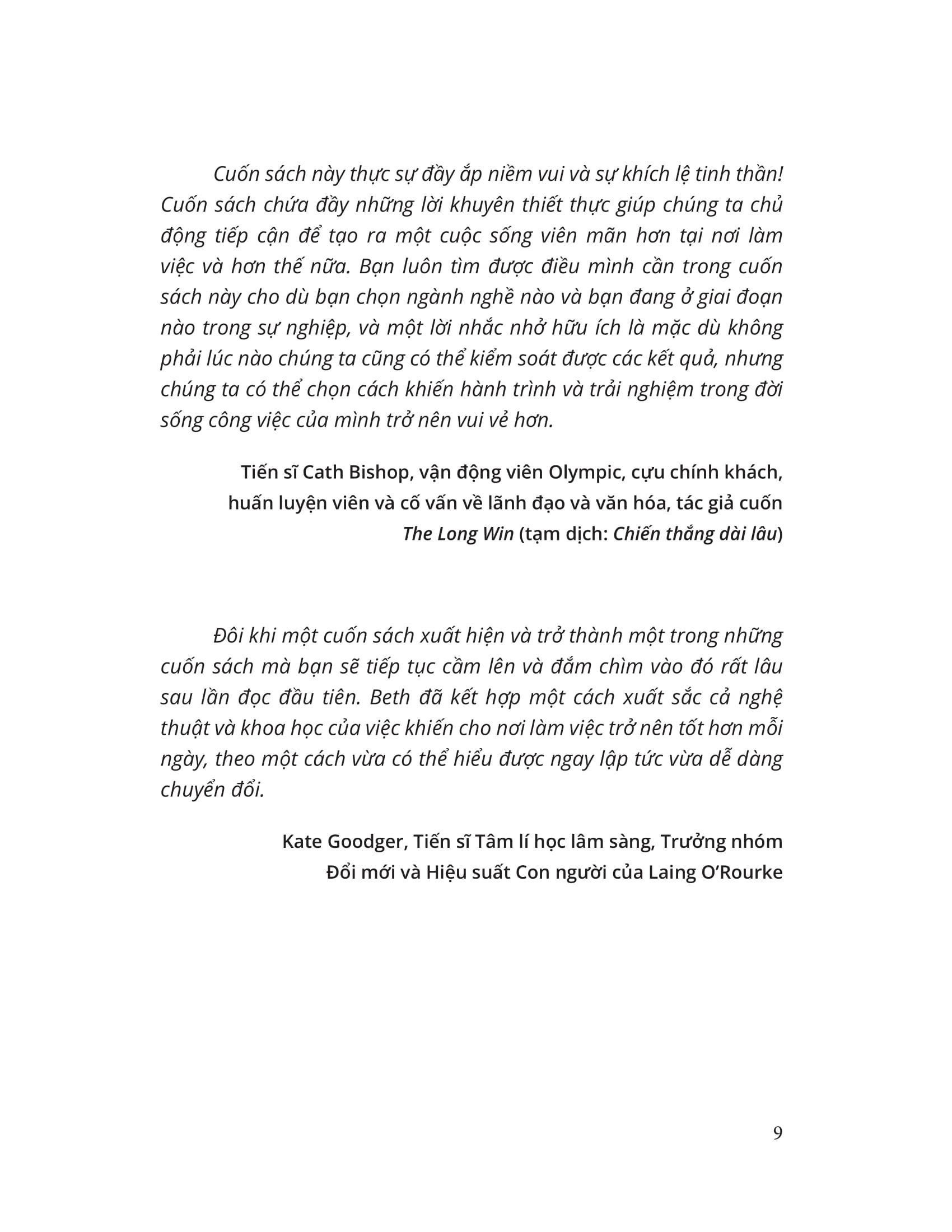 - "Niềm vui công việc" - Một bộ công cụ thực tế bạn có thể áp dụng Cuốn sách "Niềm vui công việc" là một bộ sưu tập các công cụ thực tế đã được thử nghiệm và kiểm tra mà tác giả Beth Stallwood đã thu thập qua nhiều năm làm việc với những con người đang cảm thấy chán chường và chán nản trong công việc. Cuốn sách được thiết kế để đưa bạn vào một chuyến thám hiểm nhằm tìm kiếm và duy trì nhiều niềm vui trong đời sống công sở của bạn.