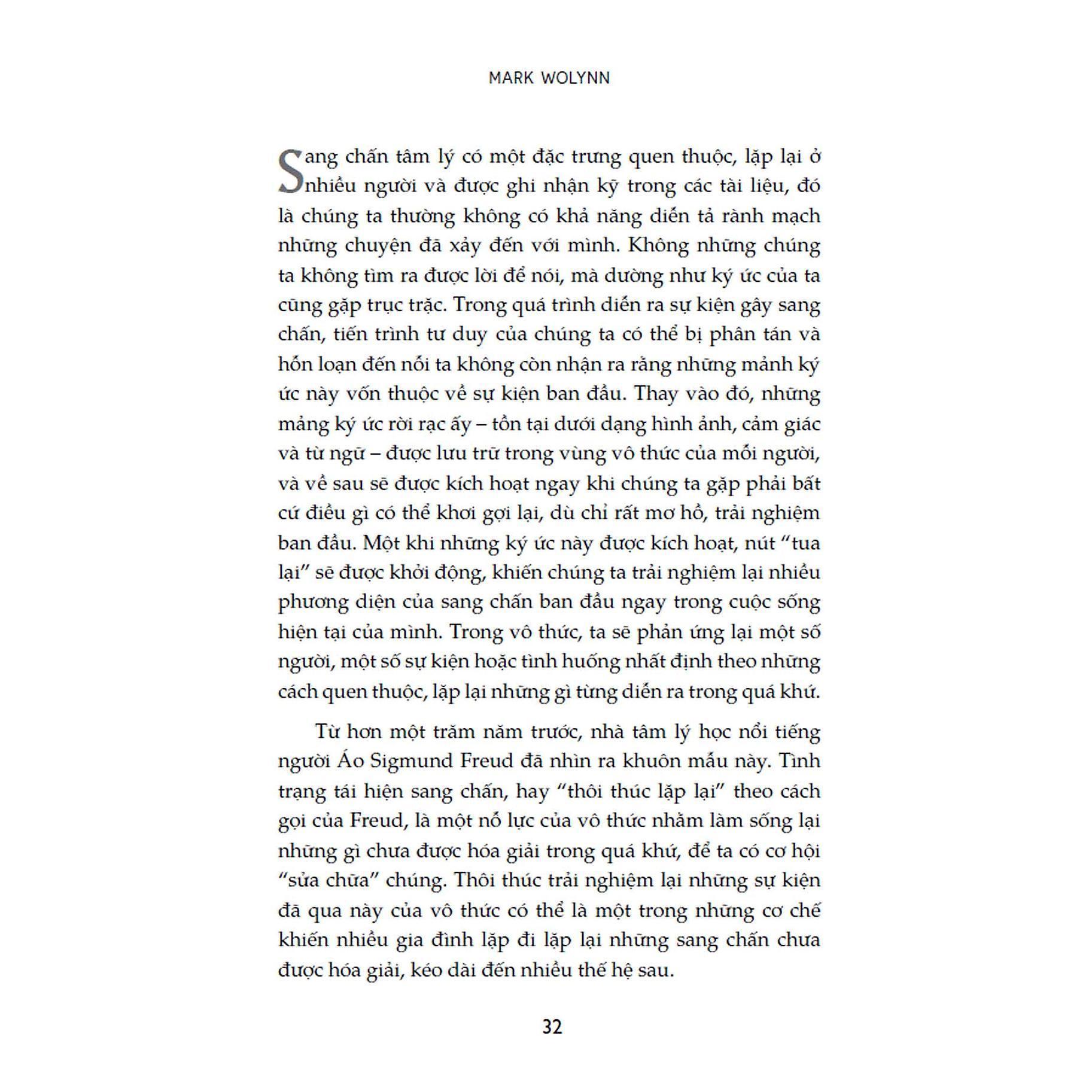 - “Cuốn sách mang tính đột phá này cung cấp những kiến thức vô cùng thuyết phục về chấn thương liên thế hệ cũng như những công cụ mới lạ và mạnh mẽ để làm giảm bớt nỗi đau đó. Mark Wolynn thực sự là một người hướng dẫn khôn ngoan và đáng tin cậy trên hành trình chữa lành này.” –