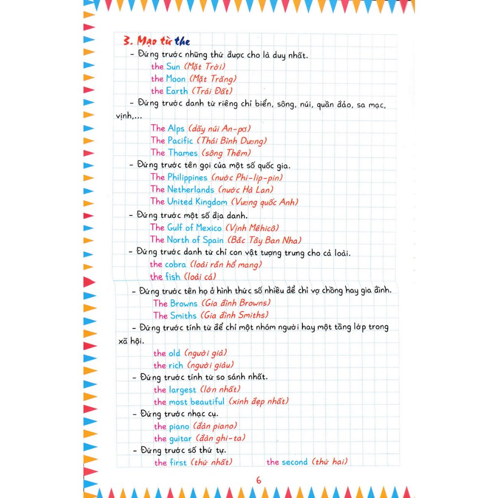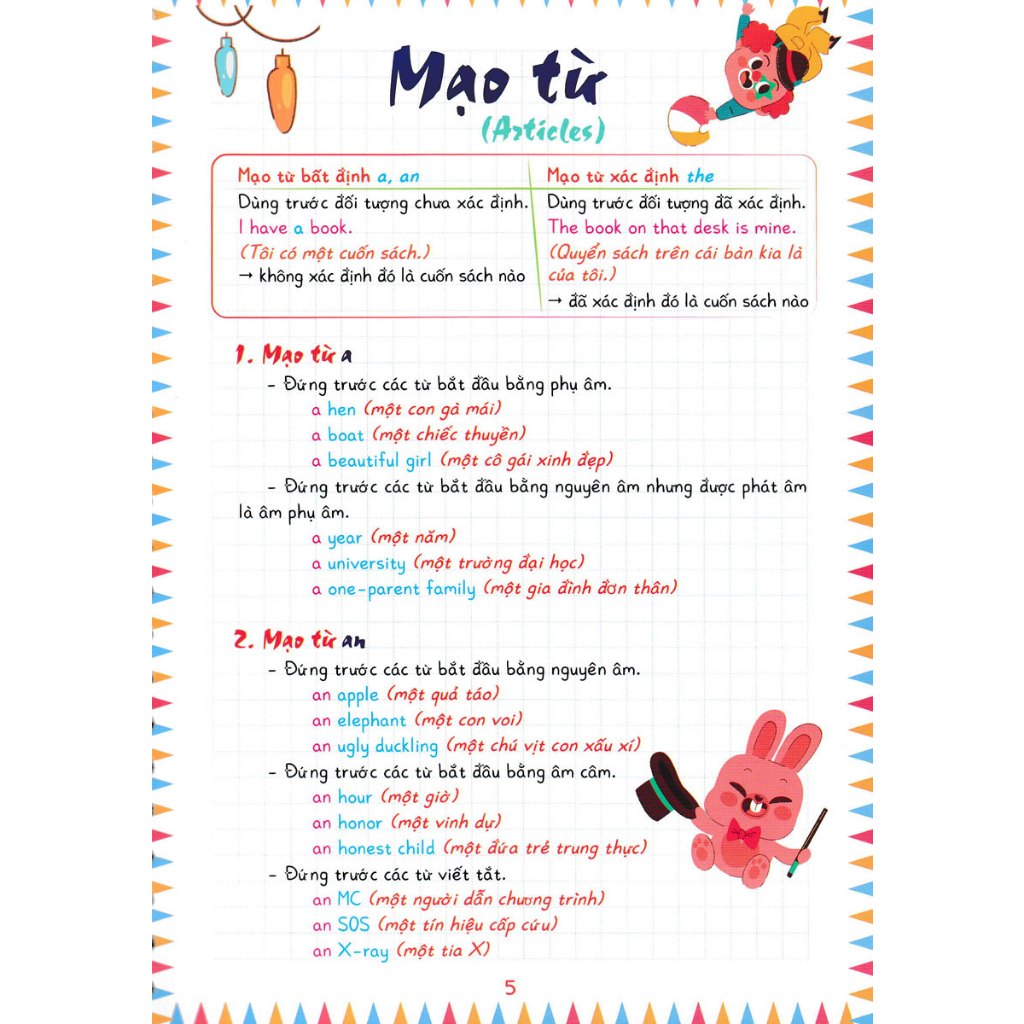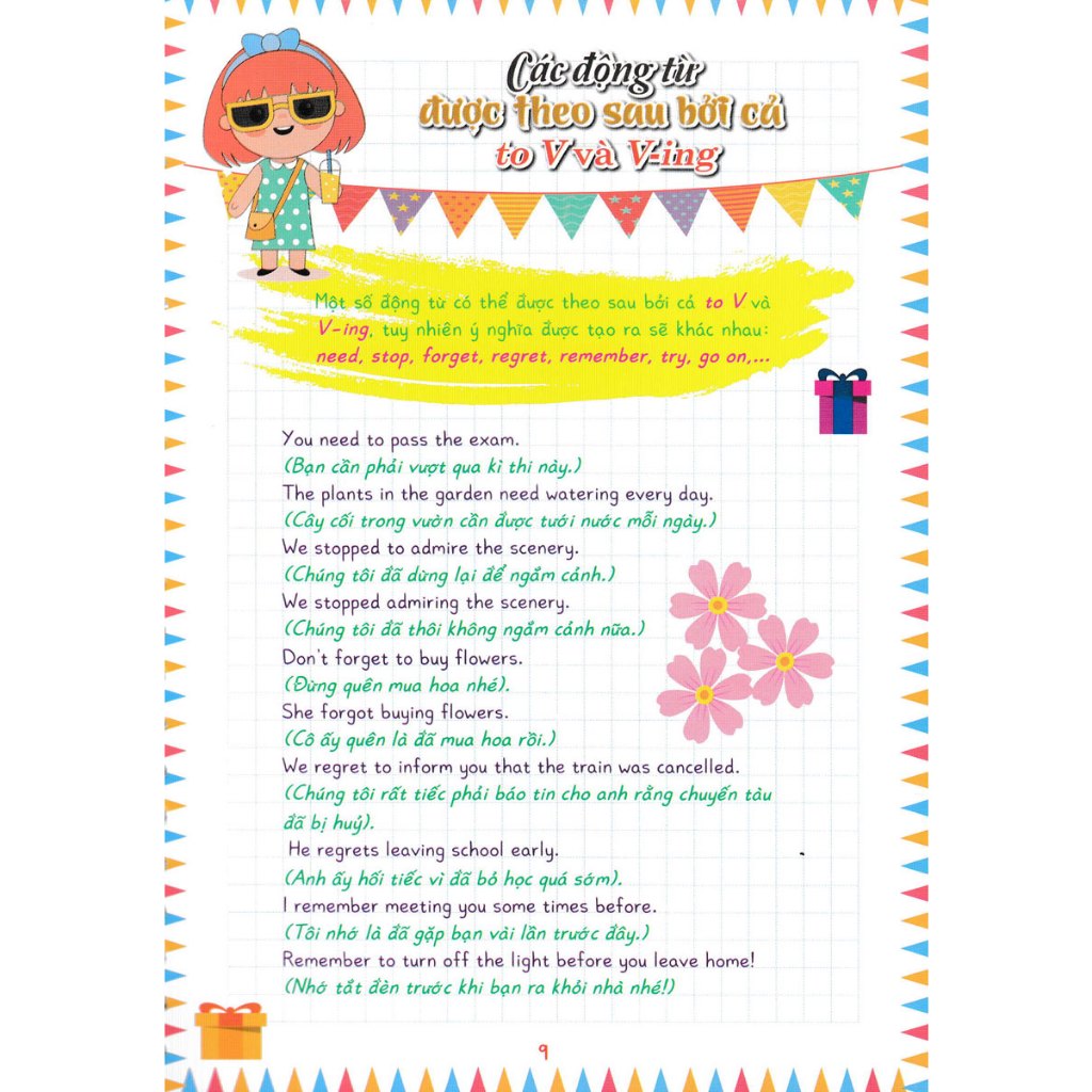 Sách tóm tắt các điểm ngữ pháp theo kiểu ghi chú ngắn gọn, giúp các em dễ dàng ghi nhớ cách dùng các mạo từ a, an, the; cách dùng động từ nguyên mẫu có to và danh động từ; các động từ chỉ sự yêu ghét; so sánh hơn của trạng từ; công