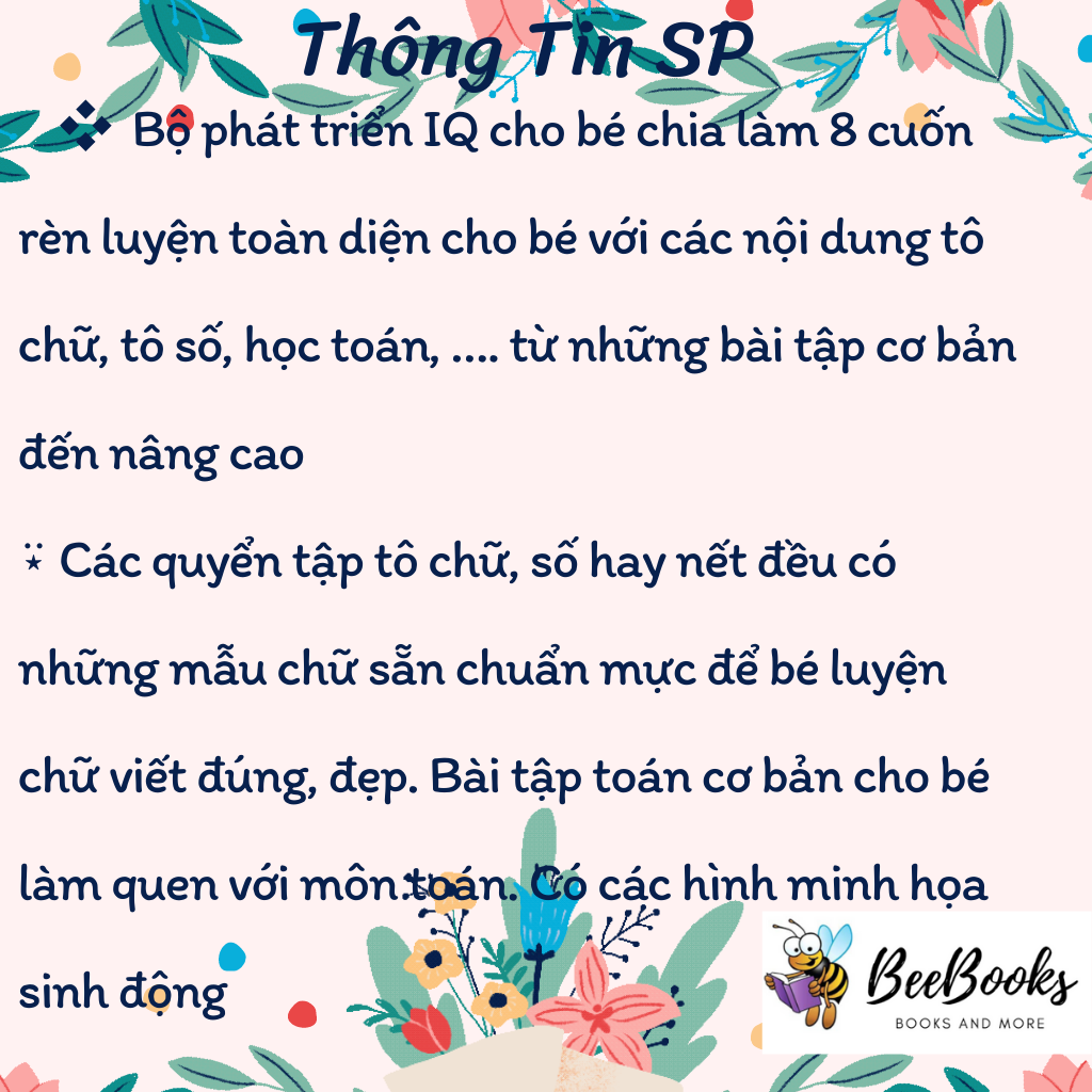 ⍣ Bộ phát triển IQ cho bé chia làm 8 cuốn rèn luyện toàn diện cho bé với các nội dung tô chữ, tô số, học toán, …. từ những bài tập cơ bản đến nâng cao