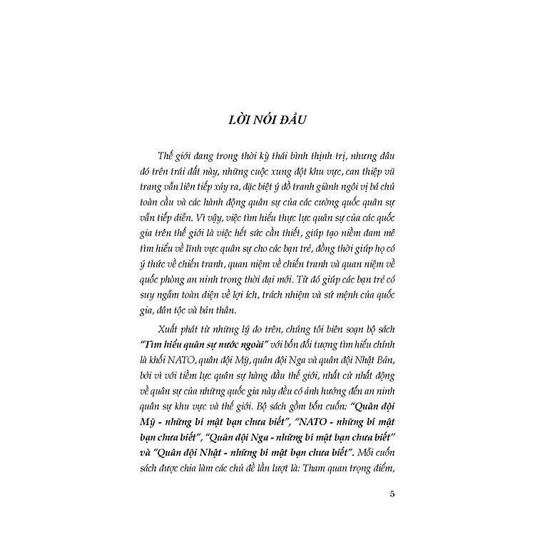 Sách - Quân Đội Mỹ - Những Bí Mật Bạn Chưa Biết Thế giới đang trong thời kỳ thái bình thịnh trị, nhưng đâu đó trên trái đất này, những cuộc xung đột khu vực, can thiệp vũ trang vẫn liên tiếp xảy ra, đặc biệt ý đồ tranh giành ngôi vị bá chủ toàn cầu và các hành động quân sự của các cường quốc quân sự vẫn tiếp diễn. Vì vậy, việc tìm hiểu thực lực quân sự của các quốc gia trên thế giới là việc hết sức cần thiết, giúp tạo niềm đam mê tìm hiểu về lĩnh vực quân sự cho các bạn trẻ, đồng thời giúp họ có ý thức về chiến tranh, quan niệm về chiến tranh và quan niệm về quốc phòng an ninh trong thời đại mới. Từ đó giúp các bạn trẻ có suy ngẫm toàn diện về lợi ích, trách nhiệm và sứ mệnh của quốc gia, dân tộc và bản thân. Bộ sách gồm bốn cuốn: “Quân đội Mỹ - những bí mật bạn chưa biết”, “NATO - những bí mật bạn chưa biết”, “Quân đội Nga - những bí mật bạn chưa biết” và “Quân đội Nhật - những bí mật bạn chưa biết”. Mỗi cuốn sách được chia làm các chủ đề lần lượt là: Tham quan trọng điểm, Giải đáp thắc mắc, Giải mã hồ sơ lịch sử, Tin tức hậu trường, Bí mật quân sự, Giải đáp kỹ thuật quân sự