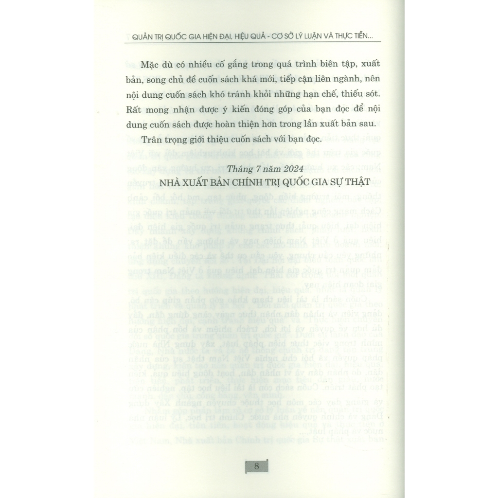 Nội dung cuốn sách làm rõ khái niệm cơ bản, đặc trưng và các yếu tố ảnh hưởng đến quản trị quốc gia hiện đại, hiệu quả; thực tiễn quản trị quốc gia hiện đại, hiệu quả ở một số quốc gia trên thế giới và bài học kinh nghiệm đối với Việt Nam; các xu hướng biến đổi chính trị, xu hướng vận động của các yếu tố kinh tế, xu hướng biến đổi văn hóa và truyền thống, môi trường biến động, phức tạp, mơ hồ; bối cảnh Cách mạng công nghiệp lần thứ tư đối với quản trị quốc gia hiện đại, hiệu quả; thực trạng quản trị quốc gia hiện đại, hiệu quả ở Việt Nam hiện nay và những vấn đề đặt ra; những yêu cầu chung, yêu cầu cụ thể và các điều kiện bảo đảm quản trị quốc gia hiện đại, hiệu quả ở Việt Nam trong giai đoạn hiện nay.