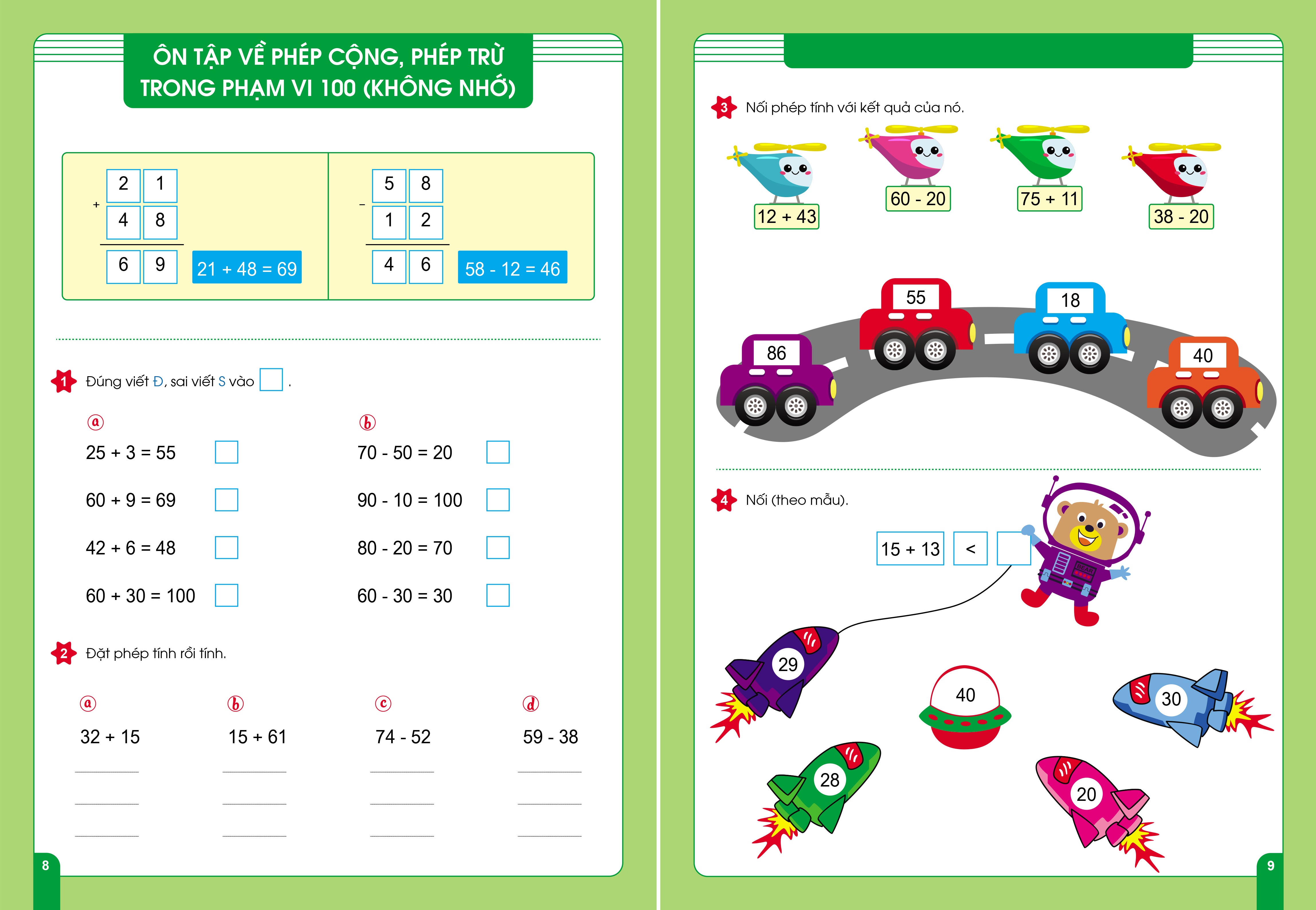 Sách được in khổ to và biên soạn theo sách giáo khoa chương trình mới, nội dung được minh họa nhiều hình ảnh ngộ nghĩnh nhằm thu hút các bé tập trung học và nhìn hình để tư duy nắm bắt kiến thức toán học dễ hiểu hơn, nhớ lâu hơn và hiệu quả tốt hơn.