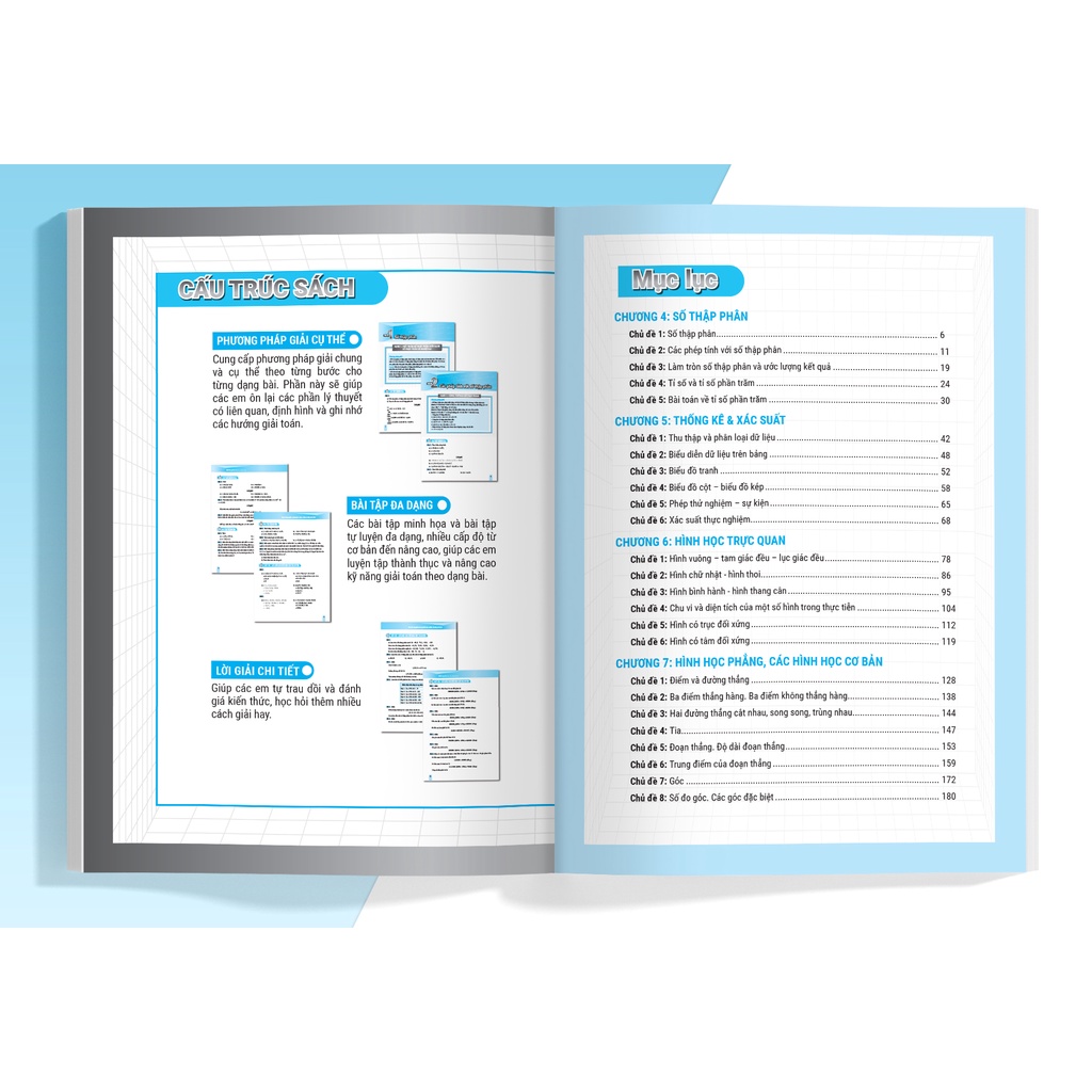 - Nội dung kiến thức bám sát khung chương trình của Bộ Giáo dục và Đào tạo - Tập 2 gồm 4 chương với 25 chủ đề bám sát chương trình mới của Bộ Giáo dục và Đào tạo như: Số thập phân, Thống kê & Xác suất, Hình học trực quan, Hình học phẳng, 2. Phương pháp giải cụ thể cho từng dạng bài Sách Cung cấp phương pháp giải chung và cụ thể theo từng bước cho từng dạng bài. Phần này sẽ giúp các em ôn lại các phần lý thuyết có liên quan, định hình và ghi nhớ các hướng giải toán.