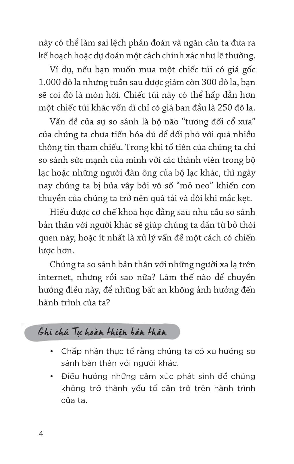Không Phải Tất Cả Những Điều “Tốt Nhất” Đều Đẹp Đẽ X, một học giả, vừa chia sẻ rằng họ đã trình bày bài nghiên cứu tại một hội nghị quốc tế. Y, một nhà hoạt động xã hội, vừa chia sẻ rằng sáng kiến phi lợi nhuận của họ đã nhận được giải thưởng tác động xã hội. Z, một họa sĩ minh họa, vừa chia sẻ rằng họ đã hợp tác với một thương hiệu thời trang lớn. Chúng ta liên tục nhận được các cập nhật từ những người đang phát triển rực rỡ và thành công ở việc họ làm giỏi nhất. Vào những ngày “chạnh lòng”, các cập nhật ấy có thể khiến ta cảm thấy cuộc đời m.ình đang tụt lại phía sau. Vào những “ngày như thế,” đọc một câu trích dẫn truyền cảm hứng kiểu “hãy tin vào quá trình” thậm chí có thể khiến bạn muốn đấm vào mặt ai đó. (Không có ý xúc phạm ai đâu nhé.) Hãy coi đây như một lời nhắc nhở rằng “làm hết sức m.ình” có thể trông rất khác nhau giữa người này và người khác. Thậm chí với cùng một người, điều đó có thể thay đổi theo từng ngày. Có những ngày, nó là việc hoàn thành chỉ tiêu doanh số hay chiến thắng một cuộc thi, nhưng vào những ngày “đen đủi” hơn, nó chỉ đơn giản là cố gắng sống sót (với mồ hôi và nước mắt). Hãy coi đây là lời nhắc rằng việc phát triển bản thân không chỉ là trở nên giỏi hơn hay đạt được nhiều thành tựu hơn. Nó còn là việc trở nên mạnh mẽ hơn, can đảm hơn để bắt đầu lại, kể cả khi bạn cảm thấy m.ình đang thụt lùi thay vì tiến bộ. Đôi khi, đó là việc bắt đầu lại từ con số không sau một quá trình buông bỏ đầy đau đớn. (Trích sách)