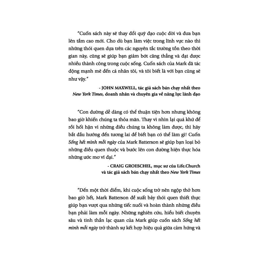 Trong Sống hết mình mỗi ngày, Mark Batterson chia sẻ 7 thói quen thiết thực, giúp thay đổi cuộc sống sẽ đưa bạn đến con đường khai thác sức mạnh của 24 giờ. Đây