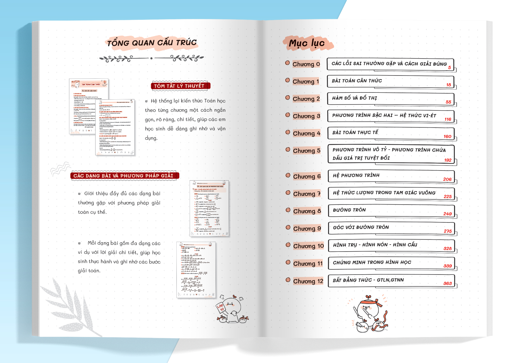 Cuốn sách bao gồm 12 chương kiến thức ngắn gọn nhất, trọng tâm nhất, chắc chắn xuất hiện 99% đề thi vào 10. Sổ tay đã được biên soạn và hệ thống hóa kiến thức toán học một cách tỉ mỉ và logic. Các chương sách được xây dựng một cách ngắn gọn, rõ ràng và chi tiết, giúp bạn nắm bắt và hiểu rõ từng khái niệm và các kiến thức cần nhớ.