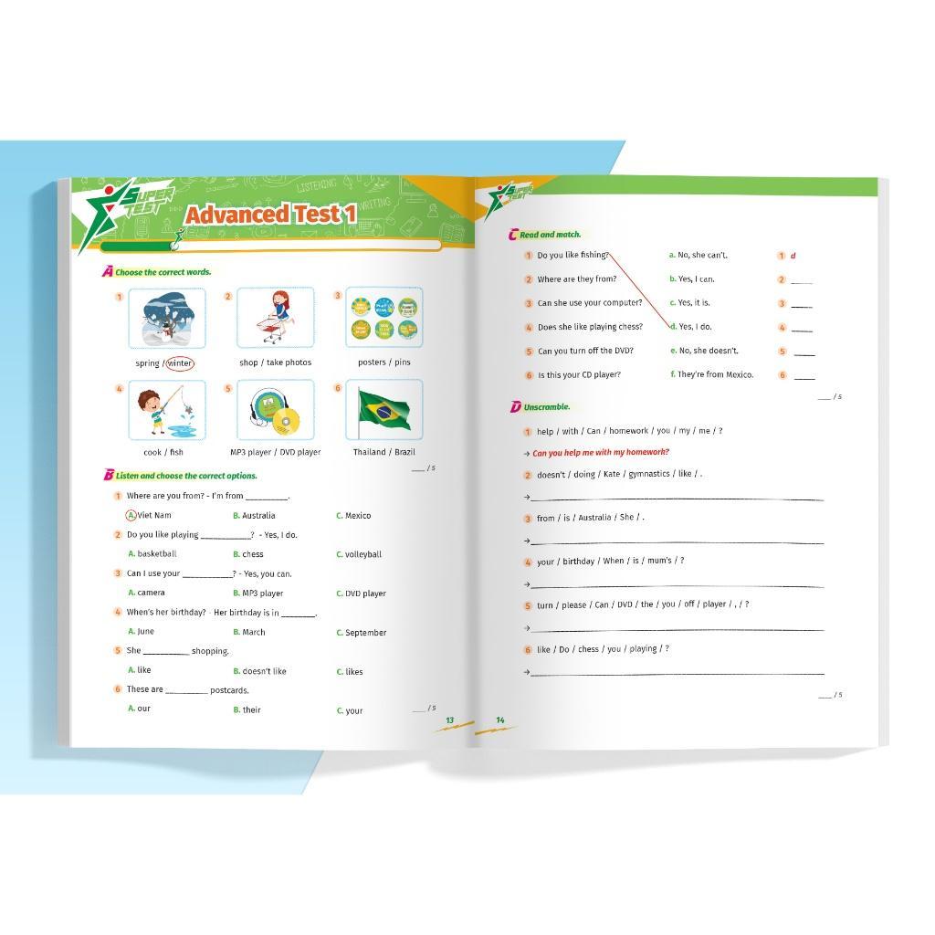 Với Bộ sách Super Test – Đề kiểm tra nhanh Tiếng Anh cho học sinh, bố mẹ sẽ giúp con tiến bộ từng ngày, tự tin với khả năng ngôn ngữ của mình khi ôn luyện Tiếng Anh bởi các bài tập về 4 kỹ năng: Nghe – Nói – Đọc – Viết được liên kết với nhau theo logic của bài học.
