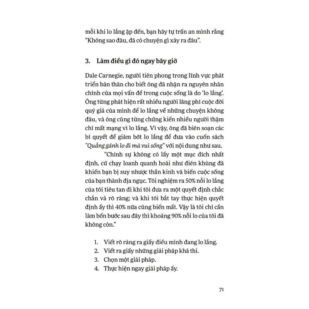 Cuốn sách muốn nói với những người trưởng thành luôn do dự và dao động vì có quá nhiều suy nghĩ. Tùy thuộc vào cách bạn trải qua tuổi 30, cuộc sống của bạn sau tuổi 40 sẽ rất khác. Có rất nhiều quyết định quan trọng ở độ tuổi 30 sẽ ảnh hưởng đến cuộc sống tương lai của bạn, vì vậy bạn không còn cách nào khác ngoài việc phải cẩn thận với những lựa chọn của mình. Nhưng vấn đề là càng nghĩ nhiều thì suy nghĩ tiêu cực càng nhiều hơn suy nghĩ tích cực, và một khi đã bắt đầu suy nghĩ tiêu cực thì bạn không biết làm cách nào để dừng lại. Cuốn sách chứa 47 lời khuyên cuộc sống dành cho bạn đọc. Là thông điệp dành cho những người muốn sống một đời không hối tiếc.