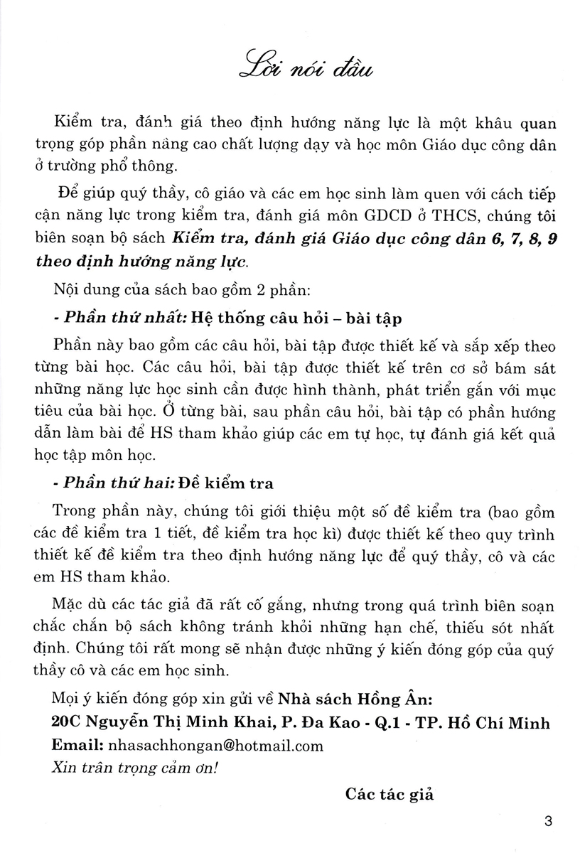 Để giúp quý thầy, cô giáo và các em học sinh làm quen với cách tiếp cận năng lực trong kiểm tra, đánh giá môn GDCD ở THCS, chúng tôi biên soạn bộ sách Kiểm tra, đánh giá Giáo dục công dân 6, 7, 8, 9 theo định hướng năng lực.