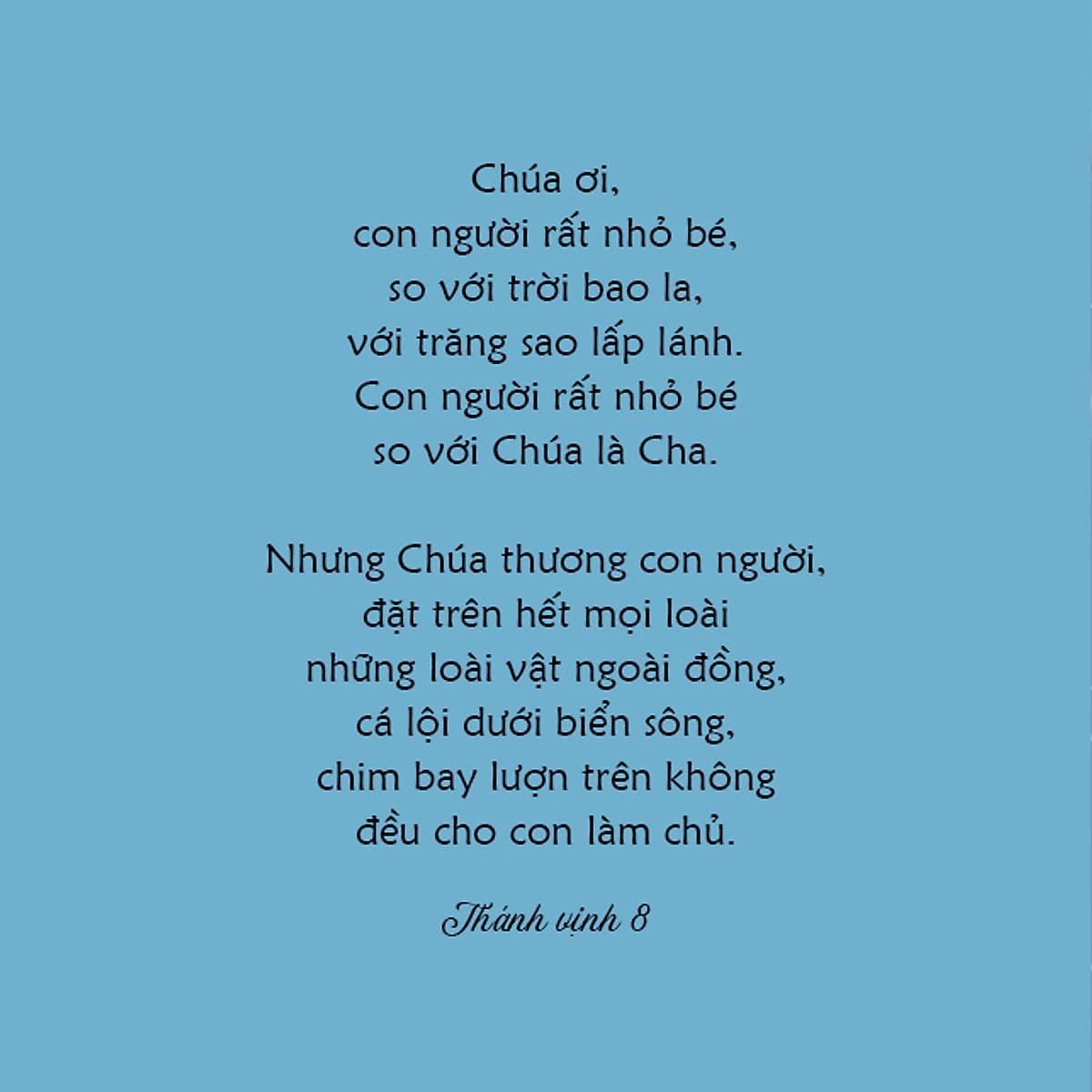 Giới thiệu sách: một cuốn sách giúp bé lắng nghe giai điệu du dương của Thánh Vịnh. Những lời cầu nguyện tín thác vào Thiên Chúa và ca ngợi những kỳ công của Ngài. Tác