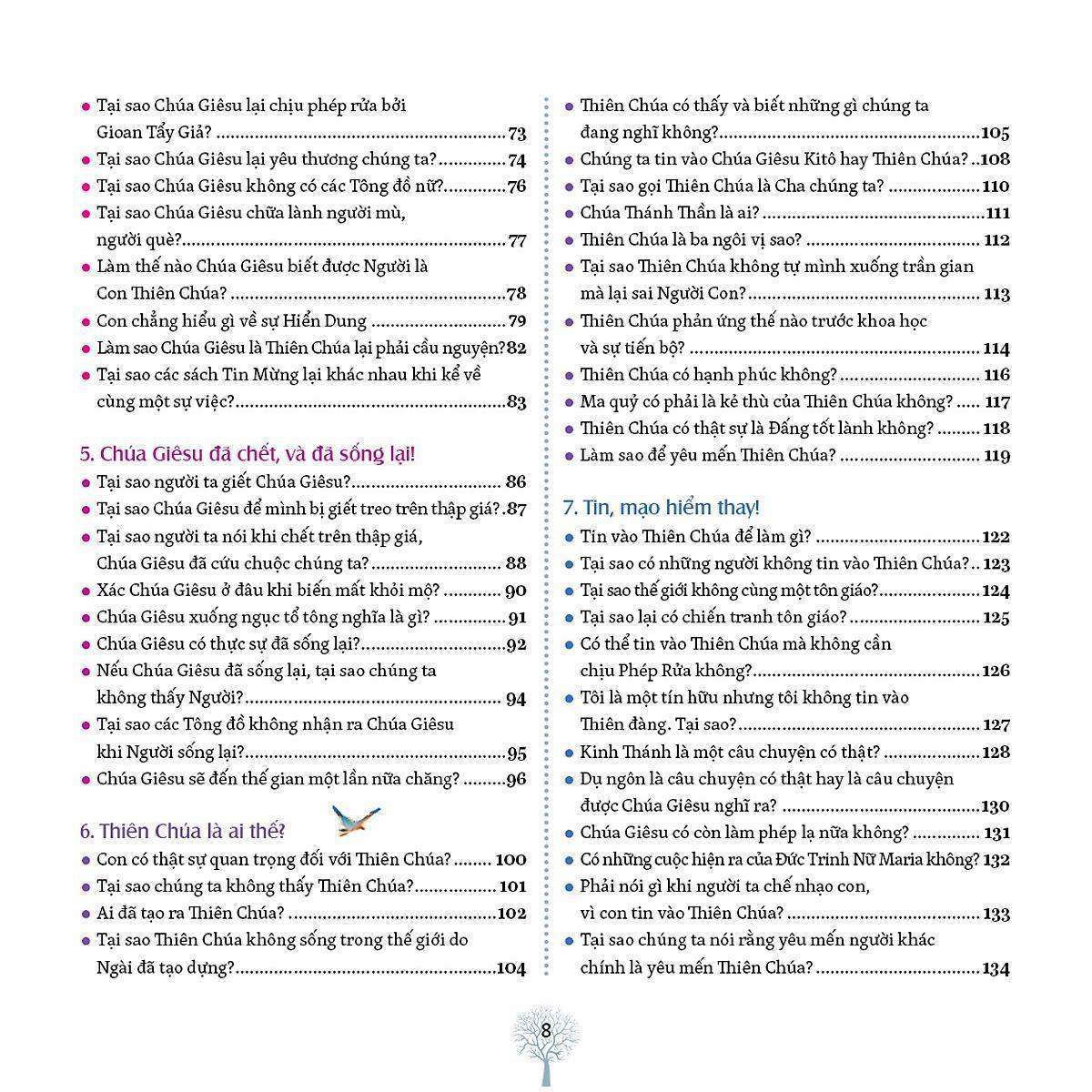 Ai đã trả lời các câu hỏi này? Đó là một nhóm gồm các bậc cha mẹ, nhà báo, linh mục. Những người này có rất nhiều kinh nghiệm nói chuyện với trẻ em về những thứ liên quan đến cuộc sống và đức tin. Họ trả lời rất nghiêm túc những câu hỏi mà các em đặt ra. Với sự kiên nhẫn, họ trả lời từng câu một. Đồng thời, họ cố gắng hiểu rõ điều mà mỗi em muốn hỏi. Để giúp các em hiểu rõ, họ sử dụng từ ngữ đơn giản, nhưng không bao giờ đánh lừa các em. Họ nói những gì họ tin, những gì họ biết, những gì họ khám phá trong cuộc sống, những gì đã giúp họ sống đến hôm nay. Đương nhiên, khi tất cả các câu hỏi này được trả lời thì cuốn sách trở nên dày cộm! Bởi vậy, các em không thể chỉ đọc nó một lần từ đầu đến cuối rồi thôi, nhưng phải đọc tới đọc lui. Các em dừng lại khi gặp câu hỏi mà mà chính các em thắc mắc. Hoặc một câu hỏi thú vị khác mà các em chưa từng nghĩ đến. Cứ như thế, qua từng trang sách, ngày này qua ngày khác, các em tiến tới. Các em sẽ khám phá ra những kho báu nhỏ thực sự quý giá giúp các em hiểu thấu các vấn đề, hoặc những sự giải thích khoa học và thú vị. Các em hãy giữ cuốn sách này bên cạnh mình để khám phá mỗi ngày một ý tưởng mới. Khi đêm về, các em thấy mình lớn lên và ước muốn tiến bước trong cuộc sống.