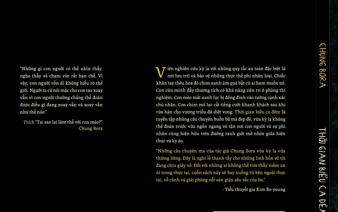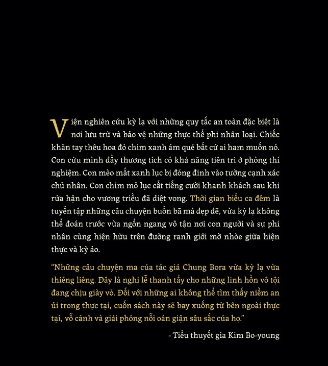 Nhà phát hành: Nhã Nam Nhà xuất bản: Hội Nhà Văn Tác giả: Chung Bora Dịch giả: Hà Linh Số trang: 212 Kích thước: 14 x 20.5cm Viện nghiên cứu kỳ lạ với những quy tắc an toàn đặc biệt là nơi lưu trữ và bảo vệ những thực thể phi nhân loại. Chiếc khăn tay thêu hoa đỏ chim xanh ám quẻ bất cứ ai ham muốn nó. Con cừu mình đầy thương tích có khả năng tiên tri ở phòng thí nghiệm. Con mèo mắt xanh lục bị đóng đinh vào tường cạnh xác chủ nhân. Con chim mỏ lục cất tiếng cười khanh khách sau khi rửa hận cho vương triều đã diệt vong. Thời gian biểu ca đêm là tuyển tập những câu chuyện buồn bã mà đẹp đẽ, vừa kỳ lạ không thể đoán trước vừa ngổn ngang vô tận nơi con người và sự phi nhân cùng hiện hữu trên đường ranh giới mờ nhòe giữa hiện thực và kỳ ảo.