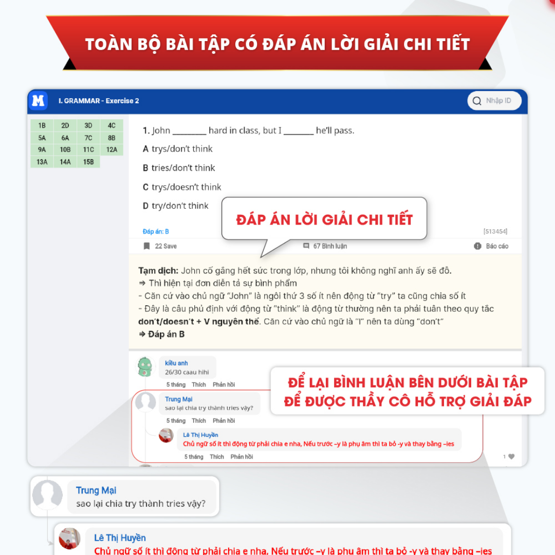- Phần Grammar: Có video bài giảng các chuyên đề lý thuyết kèm minitest thực hành.
