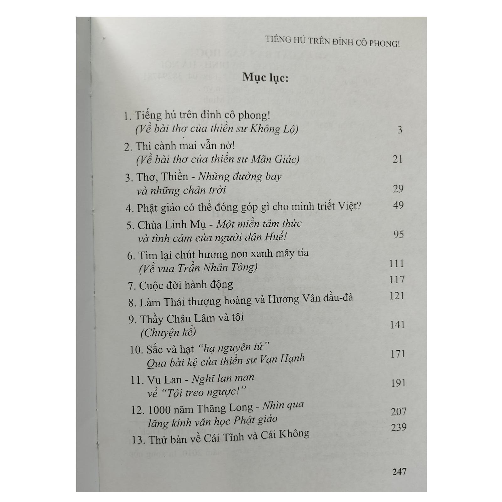 Không những đây là một tuyển tập các tiểu luận, tạp luận về văn học Phật giáo, mà như một khám phá, một cảm nhận mới về những ý tưởng, truyền ngôn của các thiền sư như Không Lộ (Tiếng hú trên đỉnh cô phong) là năng lực của sự giác ngộ, của sư Mãn Giác là cái trực ngộ (Thì cành mai vẫn nở); một nhận định khác về thế nào là thơ Thiền (Thơ Thiền những đường bay, và những chân trời), tinh thần minh triết của Phật giáo Việt Nam (Phật giáo đóng góp gì cho Minh triết Việt), cái vượt thời gian của chùa Linh Mụ (Chùa Linh Mụ – Một miền tâm thức và tình cảm của người dân Huế), tản mạn về Yên Tử và bản sắc dân tộc của Thiền Trúc lâm (Tìm lại chút hương non xanh mây tía – Cuộc đời hành động – làm Thái thượng hoàng và Hương vân đầu đà), chuyện kể về một vị Thầy (Thầy Châu Lâm và tôi), một suy nghĩ khác về ý nghĩa của tội treo ngược (Vu lan và nghĩ lan man về tội treo ngược)… và một số bài khác nữa. Tất cả cũng như là một tiếng hú trên đỉnh cô phong làm phong phú thêm cho ý nghĩa của các vấn đề tưởng rằng đã được xác định ý nghĩa rồi.