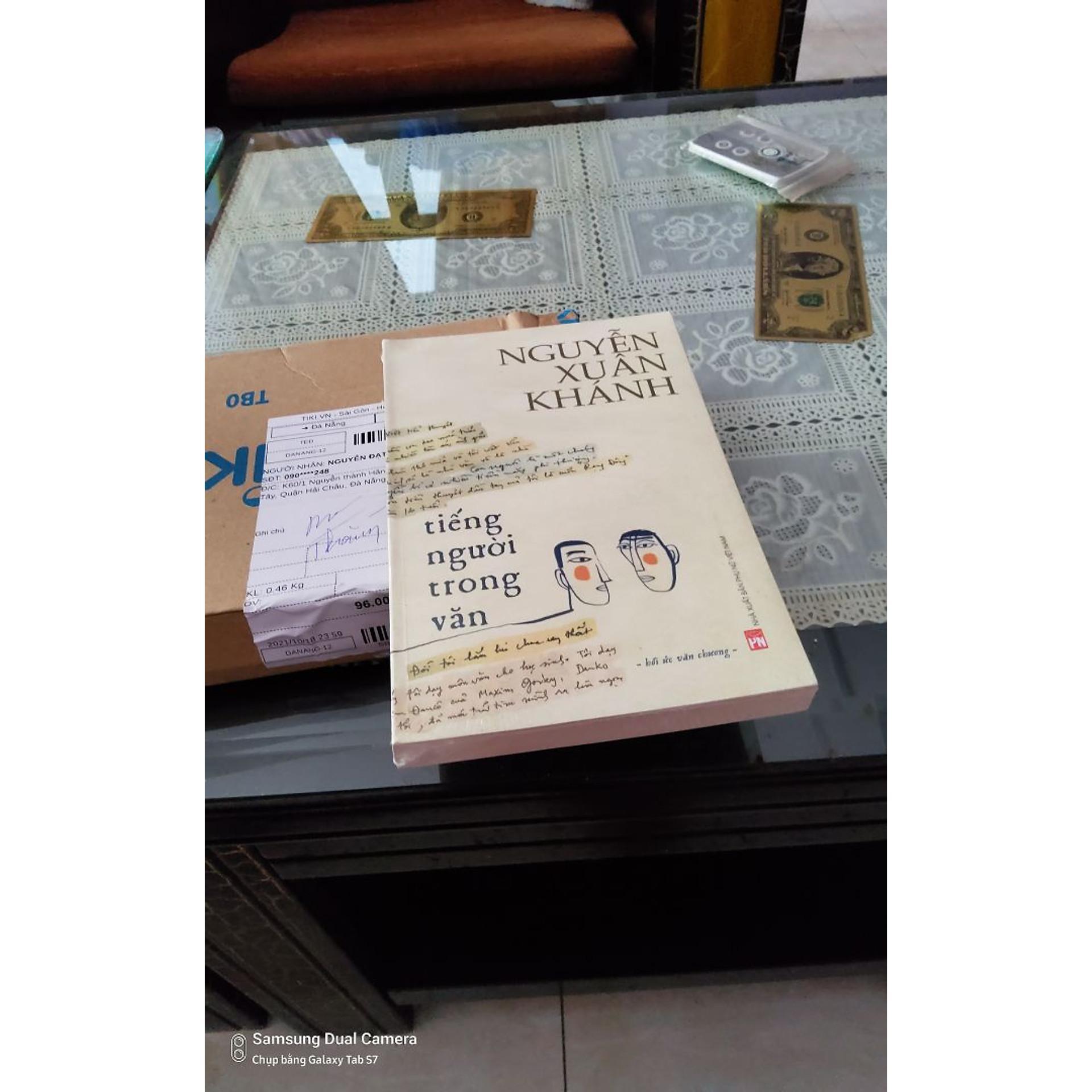 Ở Tiếng người trong văn, những câu chuyện được kể không còn chỉ là chuyện của những người thân, người bạn văn mà còn là câu chuyện cuộc đời của chính tác giả. Ấy là chuyện thời thơ ấu, ký ức về người mẹ thân yêu và những người thân thiết có ảnh hưởng rất lớn tới đời văn của tác giả. Ấy là kỉ niệm với những đồng nghiệp tên tuổi như Tô Hoài, Vũ Bằng, Trần Dần, Lê Bầu, Dương Tường, Châu Diê mà giờ đây phần lớn họ đã là người thiên cổ. Những câu chuyện lần đầu được kể, như chuyện cuốn sách đầu tiên (tiểu thuyết Rạng đông) đã bị thất lạc, khó có thể là cuốn “độc đáo” nhưng kỉ niệm về nó “tươi roi rói”, chuyện cuốn Làng nghèo viết ở Trại sáng tác Thanh Liệt cũng chỉ “trung bình thôi”, giờ không nên in. Và nhất là “chuyến phiêu lưu” li kỳ của bản thảo Trư cuồng, mà sau này có người cho rằng để xuất bản được cũng thật là một kỳ tí Qua những lát cắt đó, với quãng thời gian từ lúc tác giả Nguyễn Xuân Khánh chỉ mới là thiếu niên vô tư và nhiệt huyết, yêu thi ca và cách mạng, đến lúc thành lão nhà văn ở đầu thế ký 21, người đọc sẽ nhận ra chuyện riêng mà cũng là chuyện chung của cả đất nước trong một thời đoạn lịch sử trải từ chiến tranh vắt qua Đổi mới. Những éo le thời cuộc, những gian khổ nghề cầm bút, những trăn trở làm người và xây đời… của một trí thức đích thực, của một nhà văn lớn được chia sẻ giản dị, gọi đúng tên trong cuốn sách này. Một con người, cả đời mang “tấm lòng trong” và trí tuệ sáng, làm ngời lên “Tiếng người trong văn”.