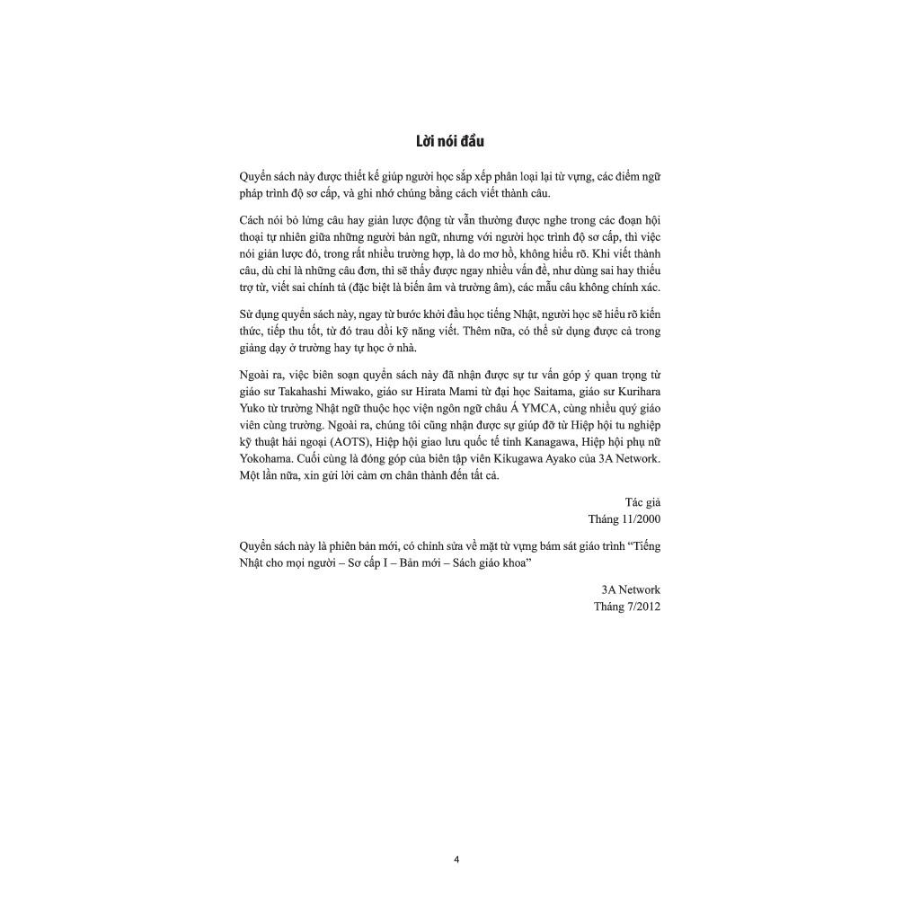 Giới thiệu tóm tắt tác phẩm: Sách nằm trong bộ Minna no Nihongo - Tiếng Nhật dành cho mọi người - Bản mới. Được thiết kế giúp người học sắp xếp phân loại lại từ vựng, các điểm ngữ pháp trình độ sơ cấp, và ghi nhớ chúng bằng cách viết thành câu. Và khi viết thành câu, dù chỉ là những câu đơn, sẽ thấy ngay nhiều vấn đề, như dùng sai hay thiếu trợ từ, viết sai chính tả, các mẫu câu không chính xá Sử dụng quyển sách này, ngay từ bước khởi đầu học tiếng Nhật, người học sẽ hiểu rõ kiến thức, tiếp thu tốt, từ đó trau dồi kỹ năng viết. Thêm nữa, có thể sử dụng được trong giảng dạy ở trường hay tự học ở nhà.