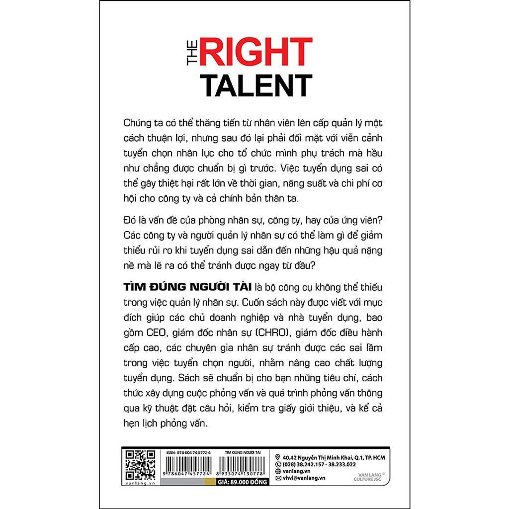 TÌM ĐÚNG NGƯỜI TÀI là bộ công cụ không thể thiếu trong việc quản lý nhân sự. Cuốn sách này được viết với mục đích giúp các chủ doanh nghiệp và nhà tuyển dụng, bao gồm CEO, giám đốc nhân sự (CHRO), giám đốc điều hành cấp cao, các chuyên gia nhân sự tránh được các sai lầm trong việc tuyển chọn người, nhằm nâng cao chất lượng tuyển dụng. Sách sẽ chuẩn bị cho bạn những tiêu chí, cách thức xây dựng cuộc phỏng vấn và quá trình phỏng vấn thông qua kỹ thuật đặt câu hỏi, kiểm tra giấy giới thiệu, và kể cả hẹn lịch phỏng vấn.