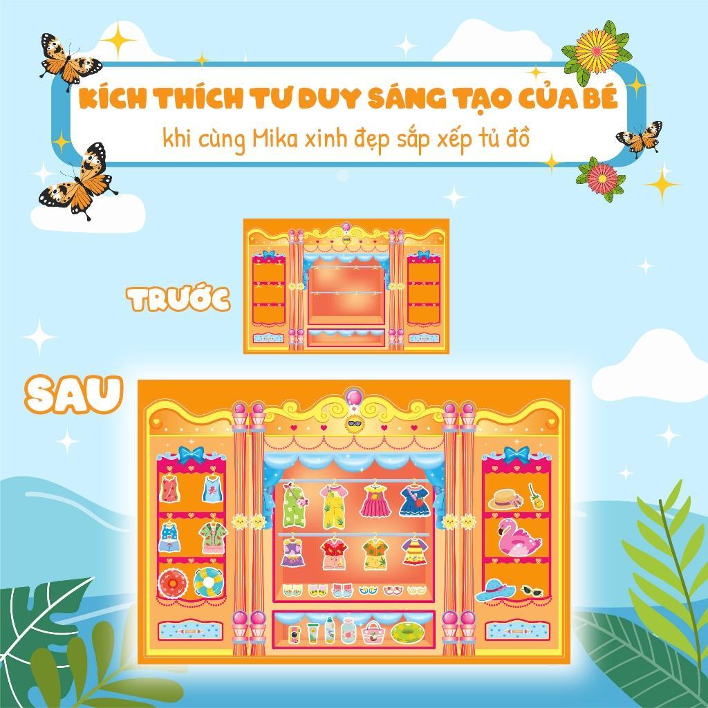1 tờ là những stickers trang phục và phụ kiện, các bạn nhỏ sẽ gỡ các sticker đó và dán sắp xếp lên tủ đồ cho Mika nhé