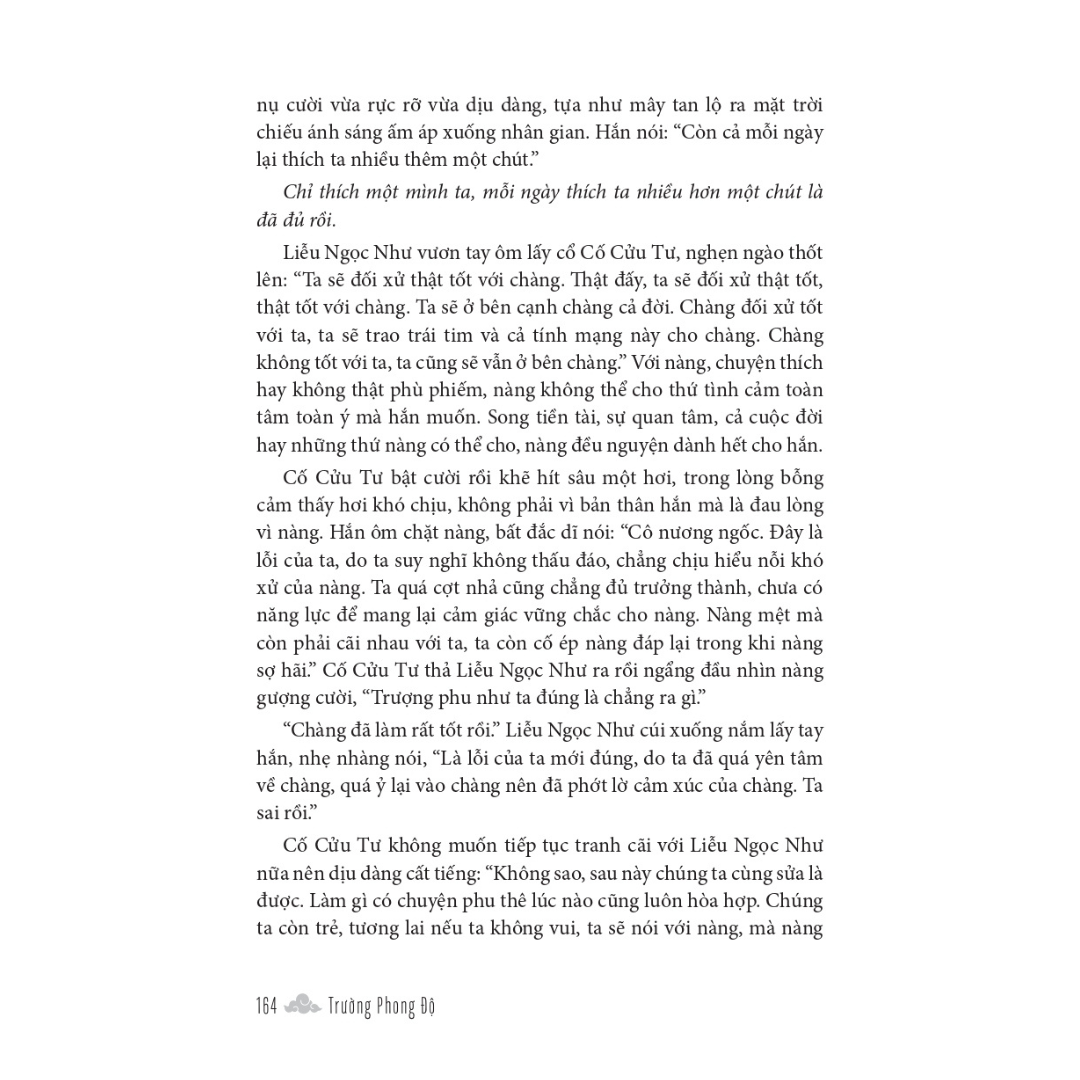 Cố Cửu Tư cười khẽ: “Nếu ta bảo cả đời này của ta chỉ có một mình nàng, nàng có tin không?”