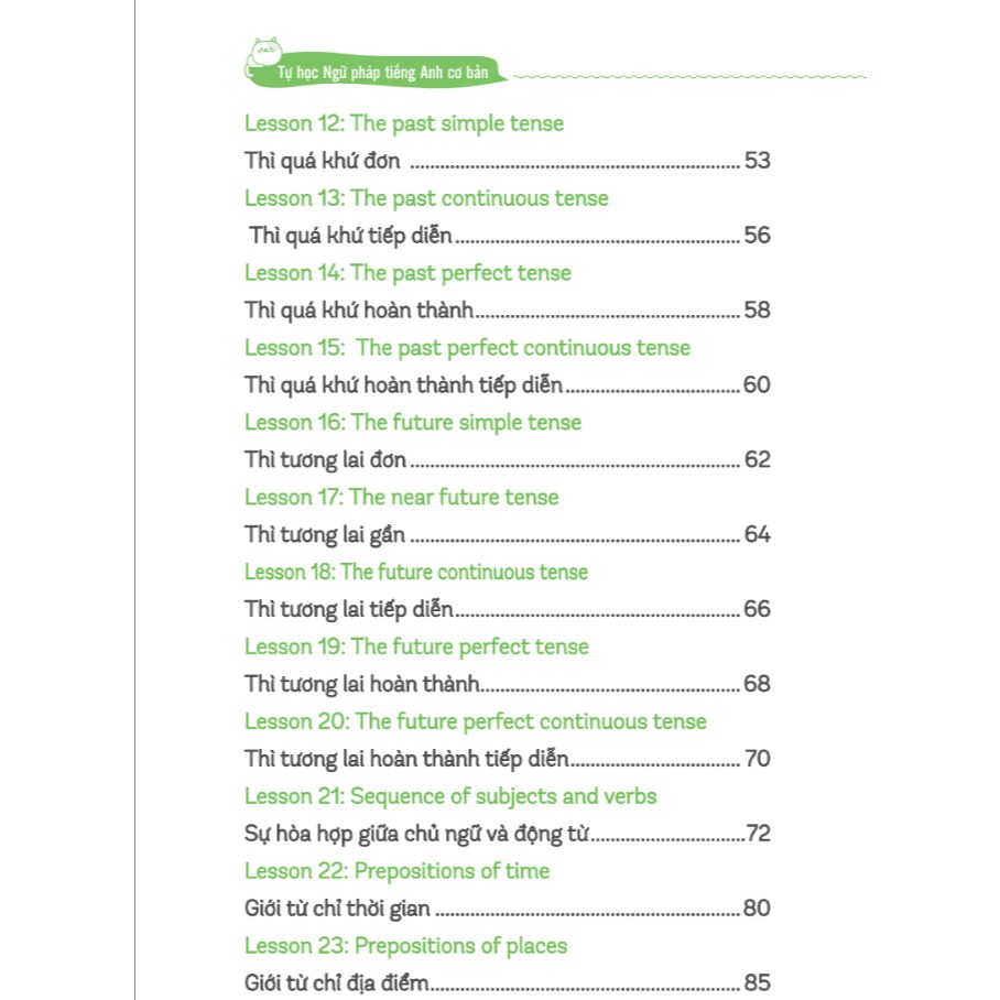 -Cuốn sách “Tự học ngữ pháp tiếng Anh cơ bản” gồm 54 bài học tương ứng với 54 ngữ pháp cơ bản nhất trong tiếng Anh.
