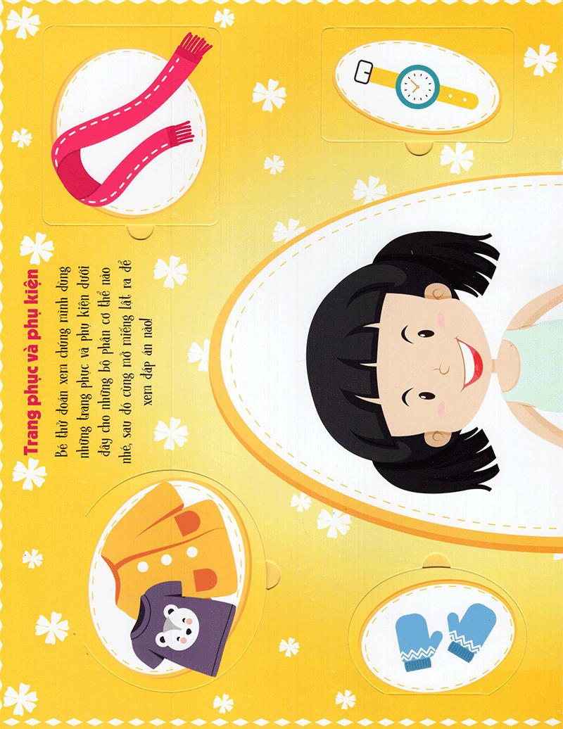 Bố mẹ và bé hãy mở cuốn sách này ra rồi lật những miếng ghép lên để cùng học rất nhiều từ song ngữ Việt - Anh về cơ thể người nhé!