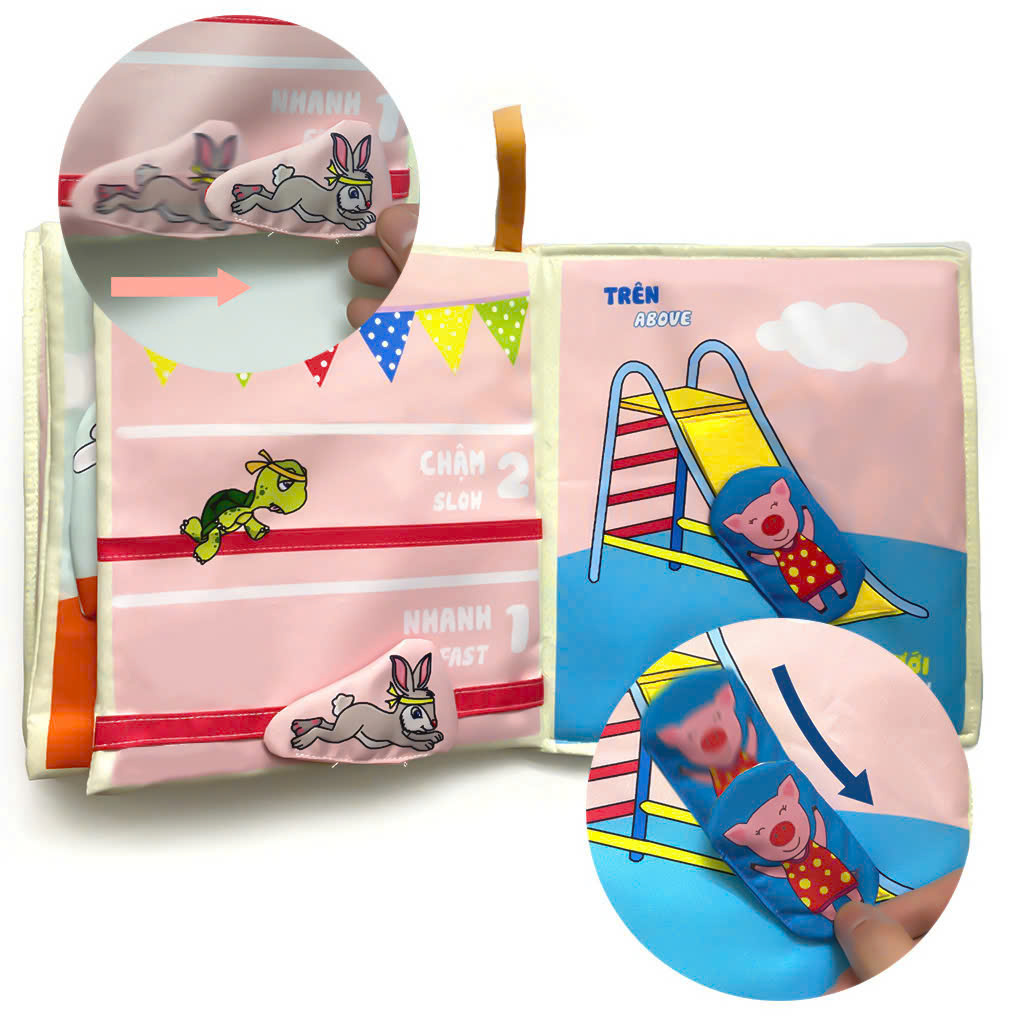 HƯỚNG DẪN SỬ DỤNG: ️ Ba mẹ có thể cho bé tự do tìm hiểu sách bằng cách cho bé tự chơi ️ Khi bé bắt đầu không để ý đến sách, ba mẹ có thể tìm chỗ bóp chít của cuốn sách bóp cho kêu, gây chú ý cho bé ️ Cuốn sách vải cho bé được xây dựng qua các phép so sánh, do đó ba mẹ có thể lật từng trang, chỉ cho bé các cách so sánh.