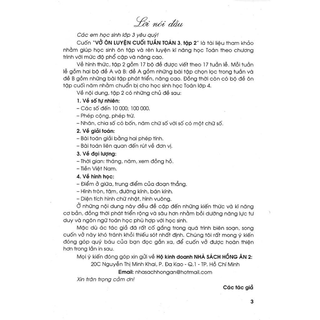 Vở Ôn Luyện Cuối Tuần Toán 3 Tập 2 (Dùng Chung Cho Các Bộ SGK Hiện Hành) Cuốn "VỞ ÔN LUYỆN CUỐI TUẦN TOÁN 3, tập 2" là tài liệu tham khảo nhằm giúp học sinh ôn tập và rèn luyện kĩ năng học Toán theo chương trình với mức độ phổ cập và nâng cao. Về hình thức, tập 2 gồm 17 bộ đề được viết theo 17 tuần lễ. Mỗi tuần lễ gồm hai bộ đề A và B; đề A gồm những bài tập chọn lọc trong tuần và đề B gồm những bài tập phát triển, nâng cao. Đồng thời còn có bộ để ôn tập cuối năm nhằm chuẩn bị cho học sinh học Toán lớp 4, Về nội dung, tập 2 có những chủ đề sau: