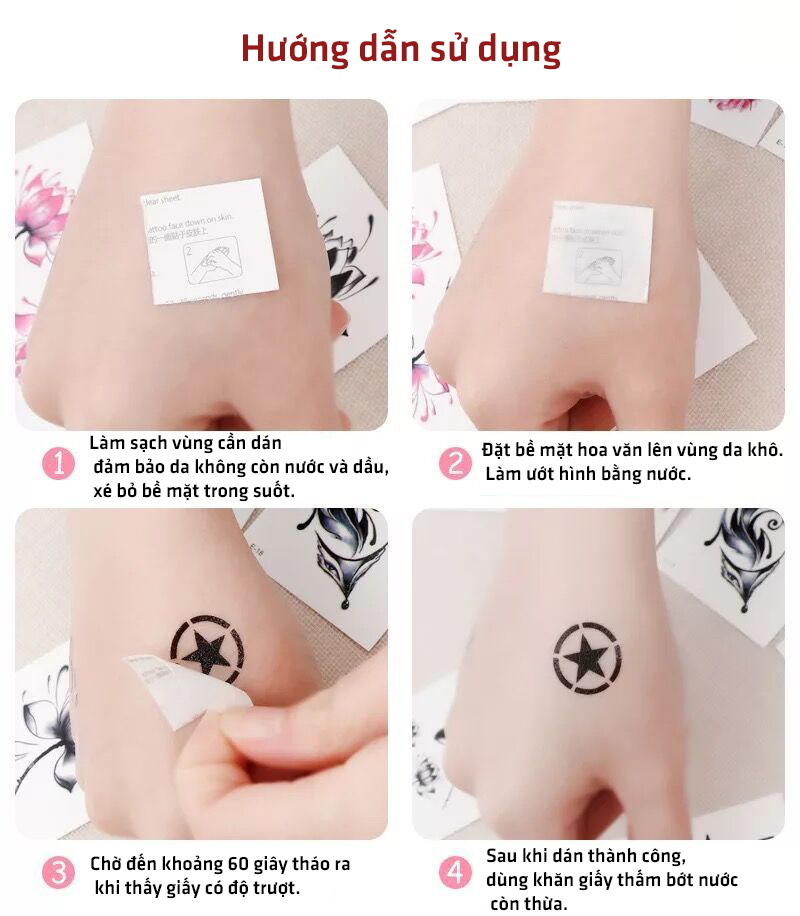Hướng dẫn sử dụng: Bước 1: Nên để xăm ngoài nắng hoặc dưới ánh sáng mạnh. Bước 2: Rửa sạch vùng da cần dán, gõ bỏ lớp nilon trong ra khỏi miếng dán. Bước 3: Dán lên bề mặt da, nhỏ 1 -2 giọt nước lên bề mặt còn lại của hình xăm và xoa đều. Bước 4: Để thấm nước khoảng 20s, đợi ướt đều rồi từ từ bong giấy ra. Bước 5: Lau khô phần nước còn lại trên bề mặt da. Bước 6: Tắt đèn và trải nghiệm Lưu ý: Nếu da có biểu hiện bị kích ứng, vui lòng ngừng sử dụng