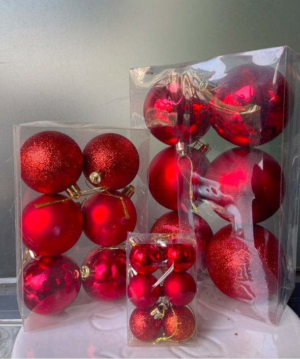 SET 24 QUẢ CHÂU TRANG TRÍ CÂY THÔNG NOEL: - Set đỏ: gồm 18 quả với 3 kích thước 2cm, 6cm, 8cm. - Set bạc: gồm 24 quả với 4 kích thước 2cm, 4cm, 6cm,