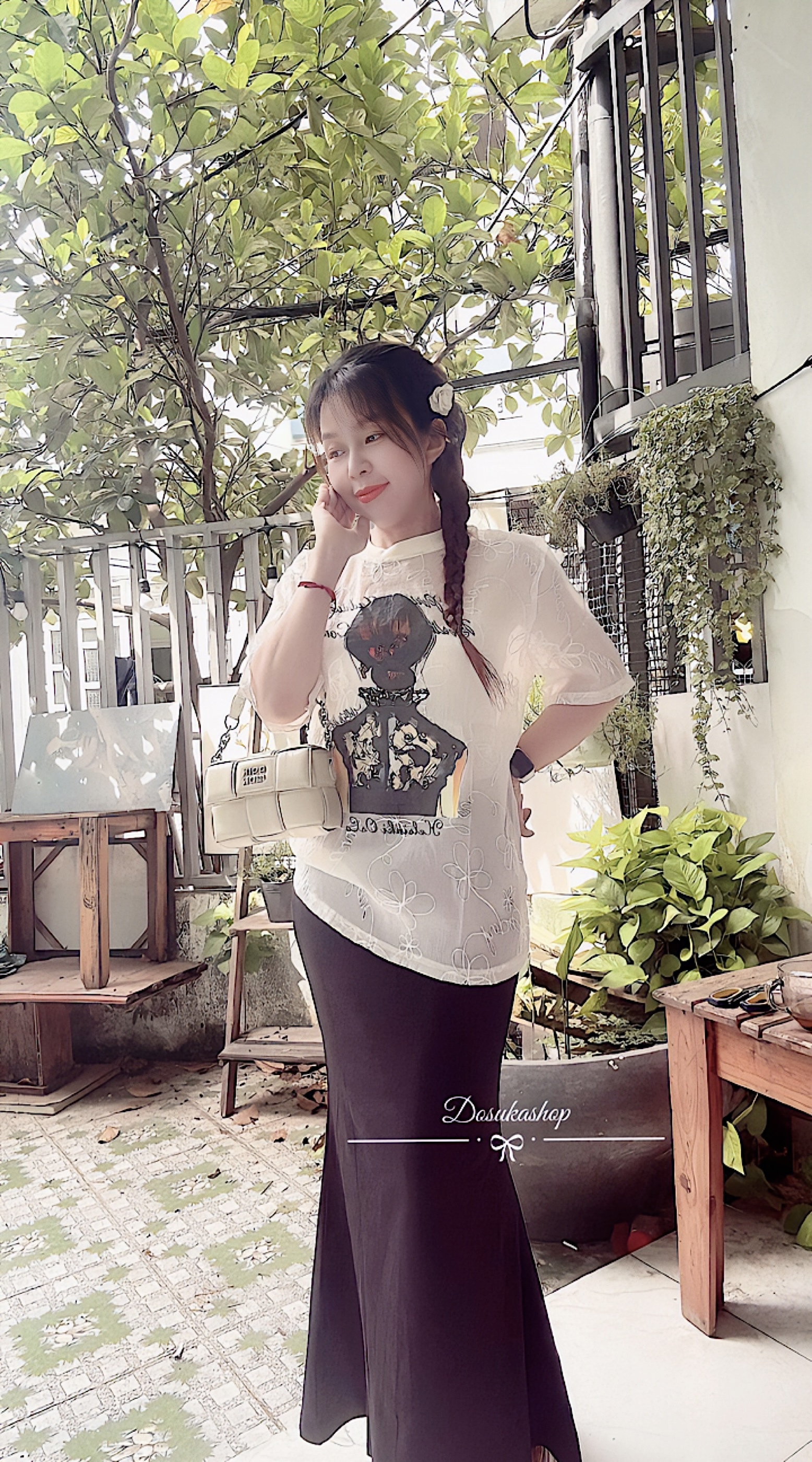 Set Áo Tơ Cổ Tim Phối Chân Váy Đuôi Cá Dáng Dài