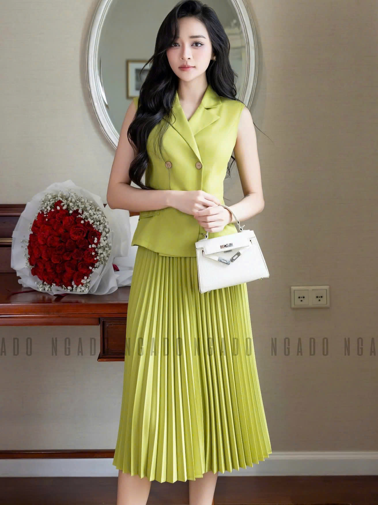 ✨Set áo váy xanh bơ xếp ly NGADO , set áo váy nữ , set công sở , dự tiệc